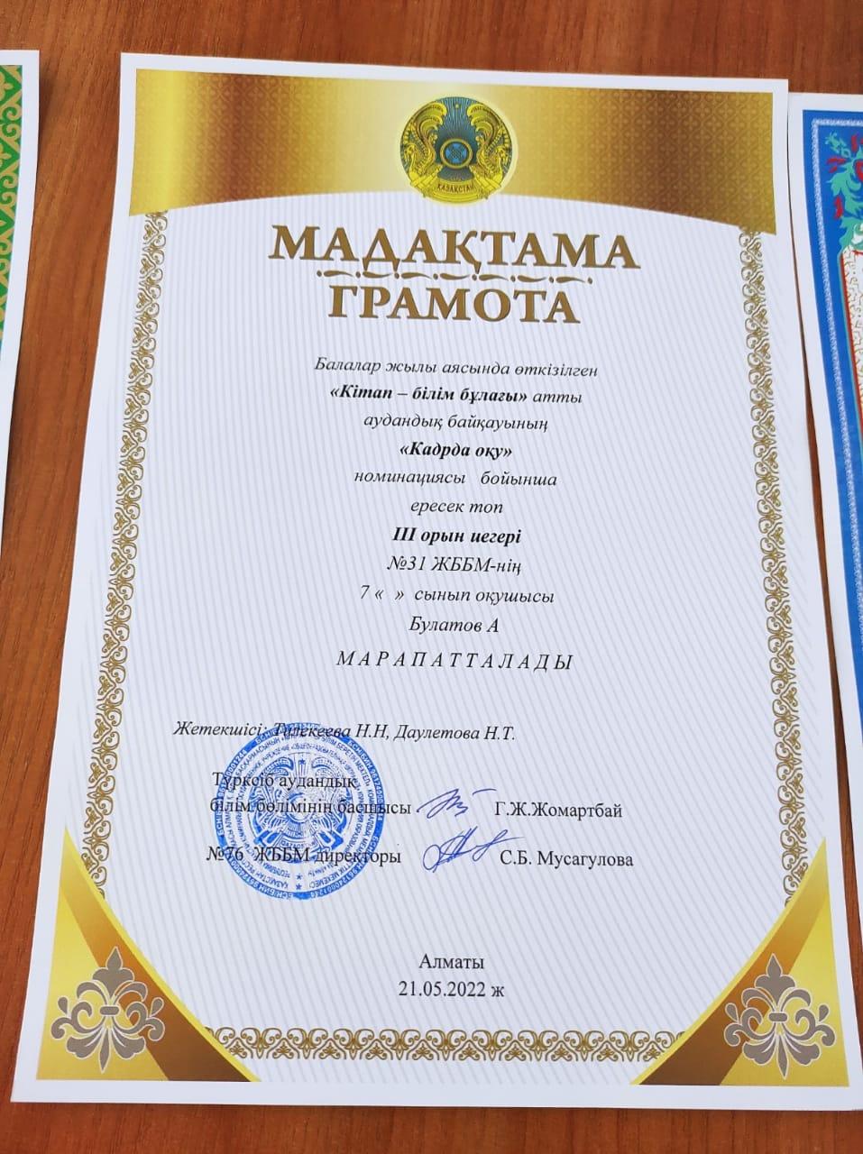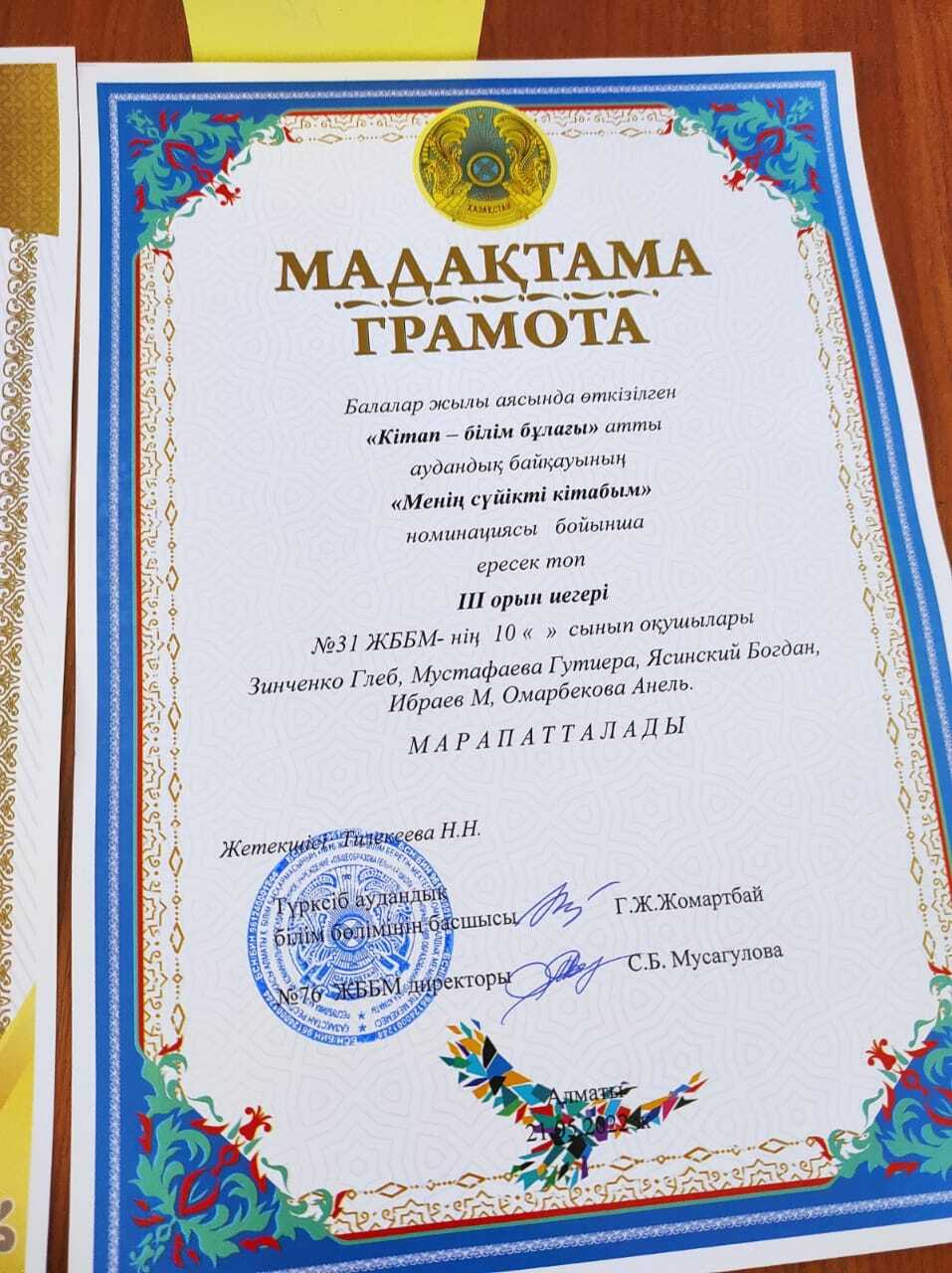 Республикалық "Алматы БАЛА fest" фестиваль аясында өткен аудандық "Кітап білім бұлағы" әдеби сайысына мектептің оқушылары белсенді қатысты.Мектеп кітапханашысы Даулетова Н,орыс тілі және әдебиет пәні мұғалімі Тилекеева Н.Н.,ағылшын тілі пәні мұғалімі Айсаева М.ұйымдастыруымен мектеп оқушылары сайыстың жүлдегерлері атанды.