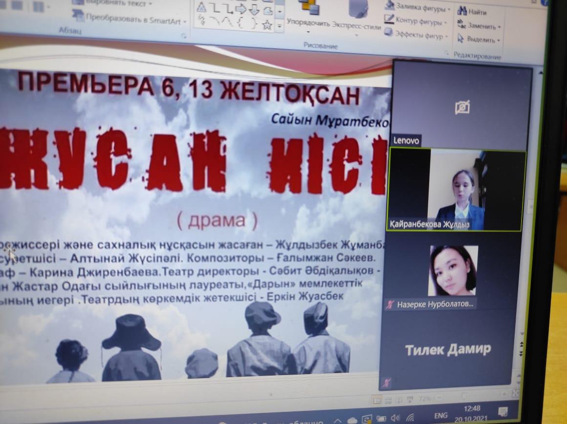 №31 ж б б мектеп кітапханшысы Даулетова Н.Т. ұйымдастыруымен Сайын Мүратбековтің 85 жылдық мерейтойына байланысты "Жусан иісі аңқыған жазушы" атты конференция ZOOM желісі арқылы 7-9 сыныптар арасында өтті. Мақсаты:Жазушының өмірі, шығармашылық жолы жайлы, шығарманың жалпы мазмұны, шығармадағы кейіпкерлер туралы, кейіпкерлердің басынан өткен қызықты сәттерінен мәлімет бере отырып, шығарманың мазмұнын ашу.Оқушылардың жүйелі сөйлей алу дағдыларын, ой – өрісін, сөздік қорларын, тіл байлықтарын дамыту.Кітапқа деген құштарлықтарын ояту.