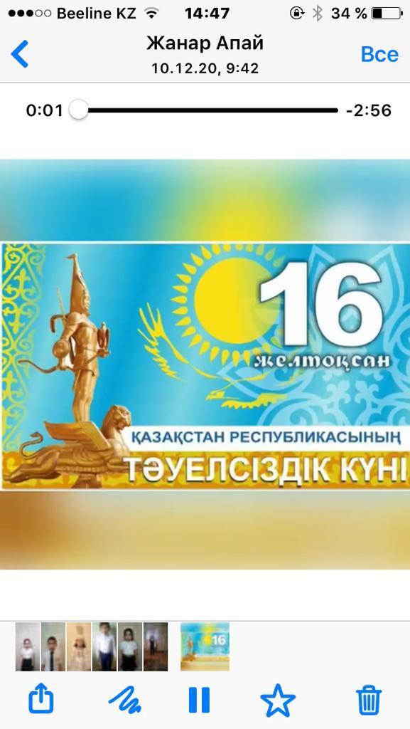 1"А"СЫНЫП.Егемен еліміз 16 желтоқсанда салтанатты жағдайда Ұлттық мереке — Тәуелсіздік күнін атап өтеді. Қазақстандықтар алмағайып өтпелі кезеңнің барлық қиындықтарын жеңіп, әлемдік сахнаға көтерілді. Республикамыздың осындай биіктіктерді бағындыруына барлық адамдар сүбелі үлес қосып келеді. Ұрпақтарының ырысы ортаймасын, намысы тапталмасын деп көксеген ата-бабамыздың арманы орындалған осы шақта баршаңызға бақыт, байлық, береке тілеймін. Еліміздің ертеңі жолындағы еңбегіміз жана берсін!