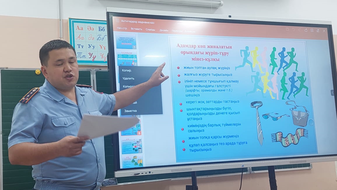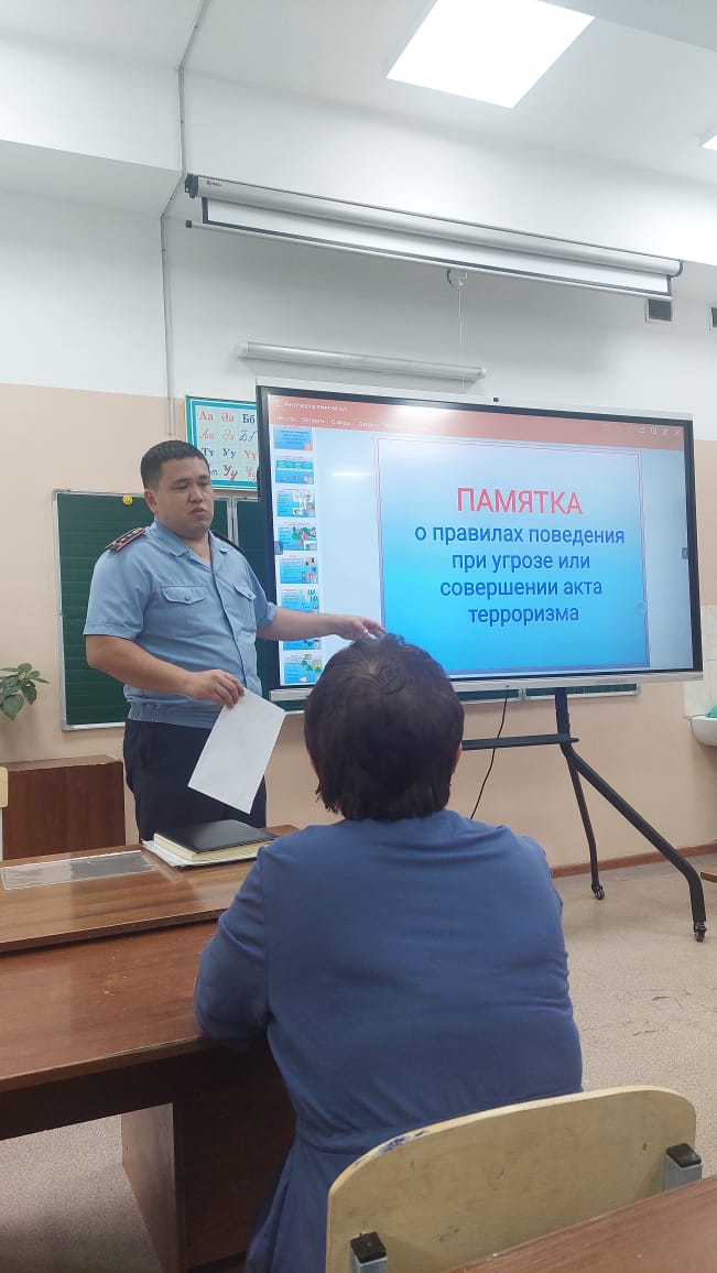Алматы қаласы Түрксіб ауданы терроризмге қарсы күрес комитетінің кураторы полиция капитаны Қайынбай Д.Қ.Терроризм – қазіргі әлемде орын алып жатқан ХХІ ғасырдағы ең қауіпті қылмыстардың бірі. Терроризмнің түрлерінің бірі – білім беру мекемелерін басып алу. Лаңкестік – бұл қазіргі заманда болып жатқан құбылыс. Осыған орай, сапалы білім берумен қатар, бүгінгі таңда балабақшалар, мектептер, колледждер мен ЖОО басшылығының басты міндеттерінің бірі – өз оқушыларының қауіпсіздігін қамтамасыз ету. Білім беру мекемесіндегі лаңкестікке қарсы іс-шаралар білім беру нысандарына шабуыл жасаудың алдын алуға көмектеседі. Олар белгілі бір құжаттарды әзірлеуден бастап, білім алушылар мен оқу орнының жұмыскерлеріне, оның ішінде аула сыпырушылар мен күзетшілерге нұсқау беруге дейінгі барлық шараларды қамтиды деп атап көрсетті. Куратор оқыған лекция және презентациядан терроризмнің алдын алу бойынша көптеген мәліметтер мектеп ұжымына берілді.