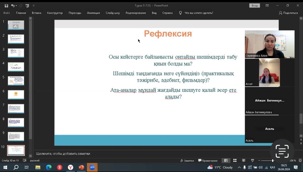 7-е занятие "Центра поддержки родителей " провела Серекеева А. М. Нурмуханова А. М. в онлайн формате. Тема: Секреты общения с подростками. Затронутые вопросы: 1.Самое важное в жизни подростка – дружба. 2.Дружба современных детей. Подростковые субкультуры. 3.Конфликты между подростками. Запугивание. Лучше, чем тот, кто вырос неприлично, Ива, выросшая в порядке.4.Поведенческие стратегии родителей. 5.Национальные ценности, такие как» принятие«,» уважение«,» искренность " – основа позитивного общения между людьми.
