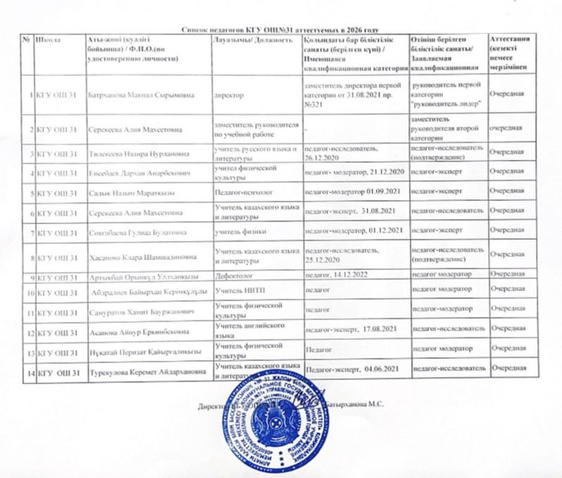 Список педагогов КГУ ОШ№31 аттестуемых в 2025-2026 году