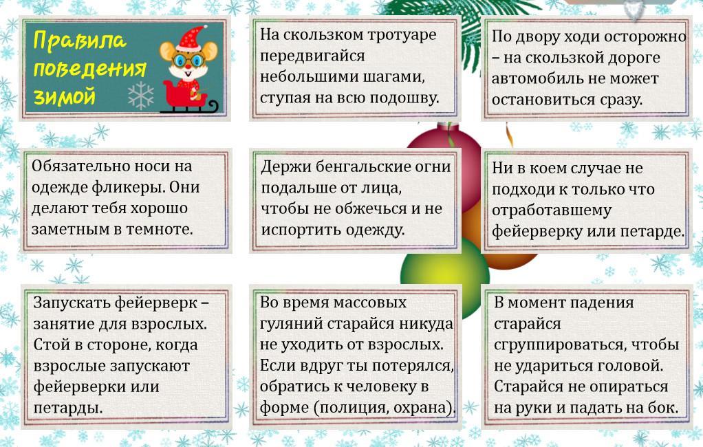 3. Соблюдай правила культурного поведения в общественных местах. Соблюдай правила охраны жизни и здоровья во время новогодних мероприятий, не используй хлопушки, бенгальские огни, петарды и другие пиротехнические средства.