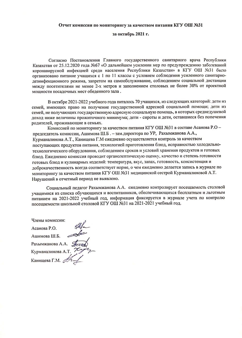 30 қазан 2021 0 1 2 3 4 5 Тамақтану мониторингі комиссиясының қазан айындағы есебі. Отчет комисси по мониторингу за качеством питания за октябрь