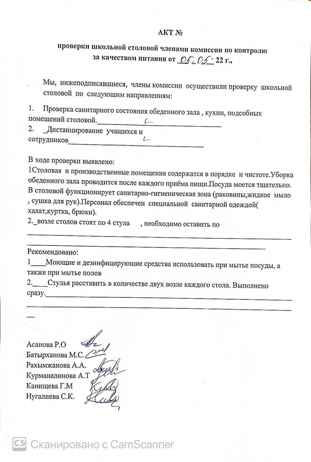 05 мамыр 2022 0 1 2 3 4 5 АКТ проверки школьной столовой членами комиссии по контролю за качеством питания от 05.05.2022 г.