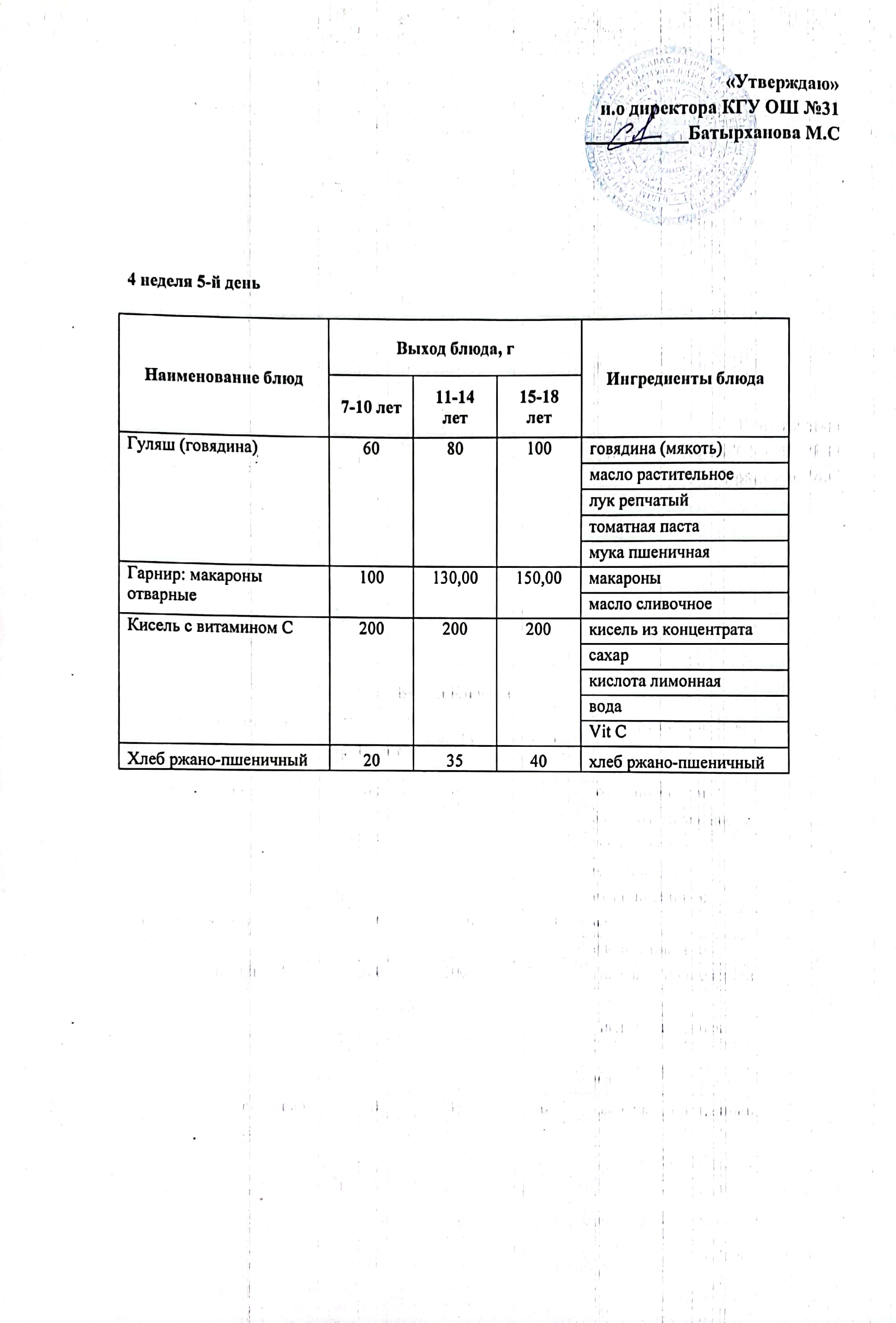 Ас мәзірі 4 апта 5 күн. Меню бесплатного питания 4 неделя 5-ый день