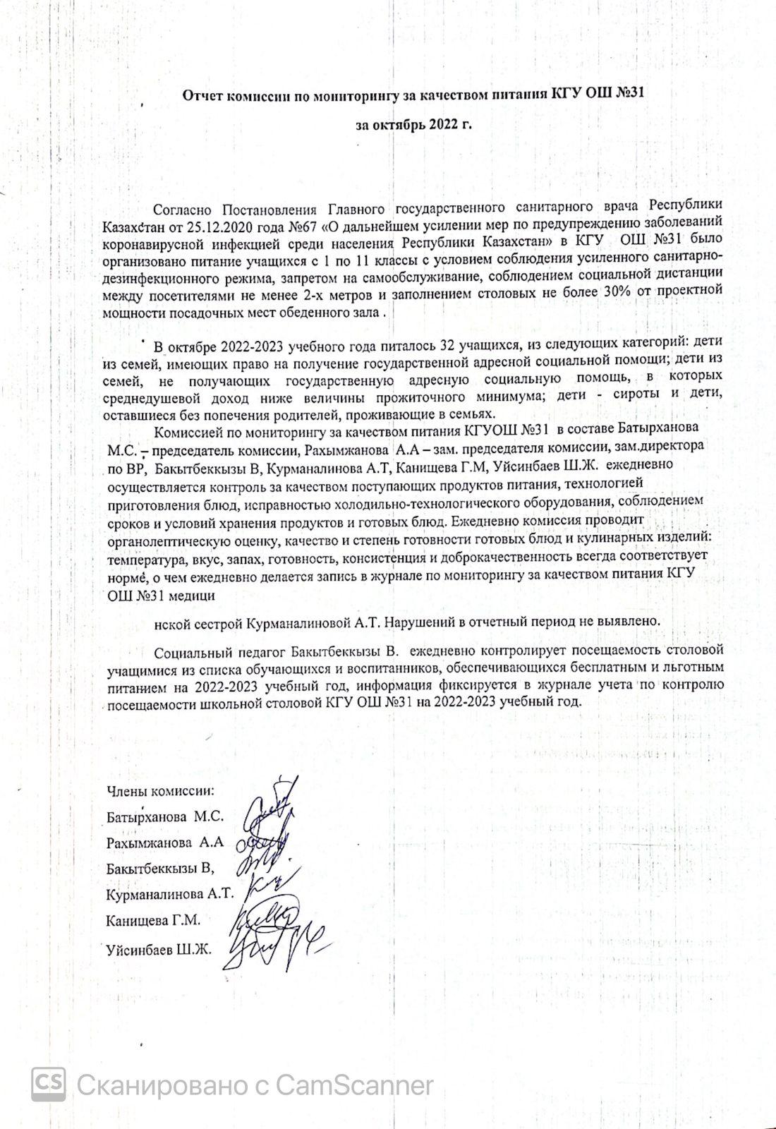 Тамақтану сапасын бақылау жөніндегі комиссияның қазан айындағы есебі