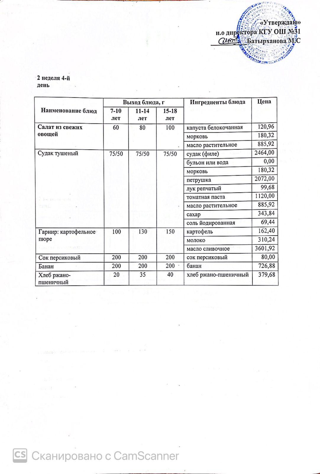 Ас мәзірі 2 апта 4 күн. Меню бесплатного питания 2 неделя 4-ый день