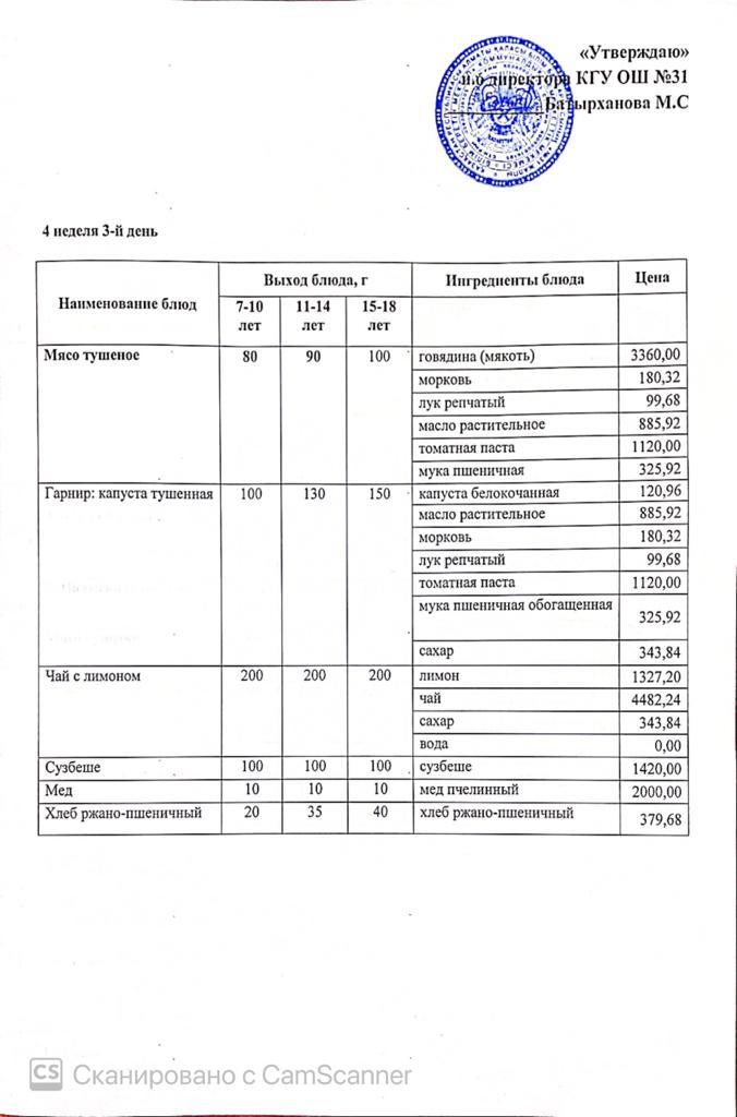 » Ас мәзірі 4 апта 3 күн. Меню бесплатного питания 4 неделя 3-й день