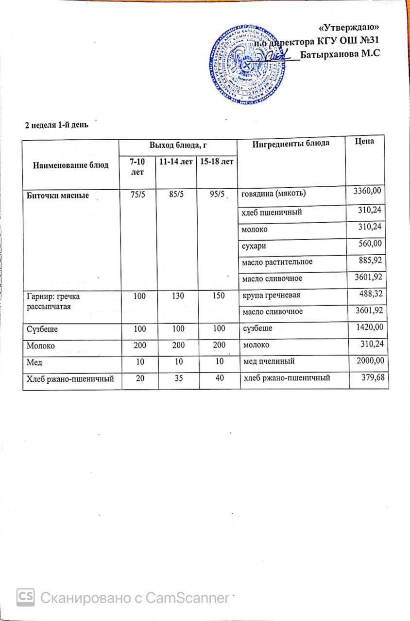 Ас мәзірі 2 апта 1 күн. Меню бесплатного питания 2 неделя 1-ый день