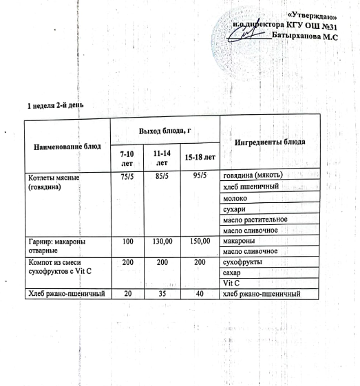 Ас мәзірі 2 апта 1 күн. Меню 2 неделя 1 день
