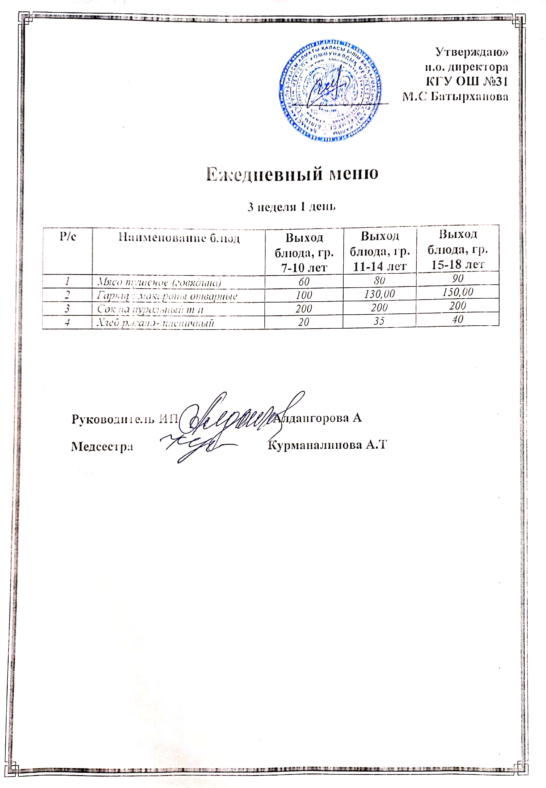 Ас мәзірі 3 апта 1 күн. Меню 3 неделя 1 день.