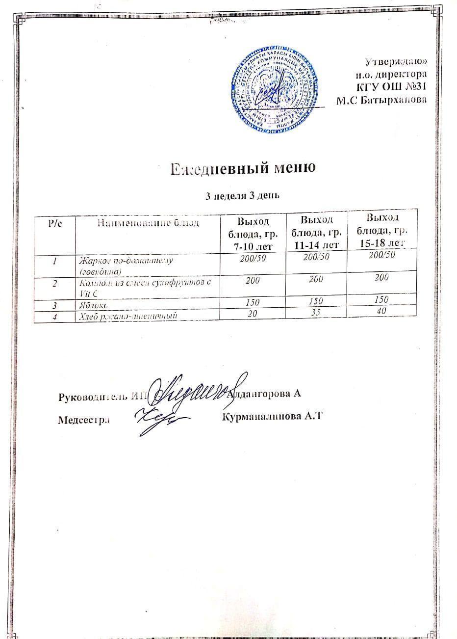 Ас мәзірі 3 апта 3 күн. Меню 3 неделя 3 день.