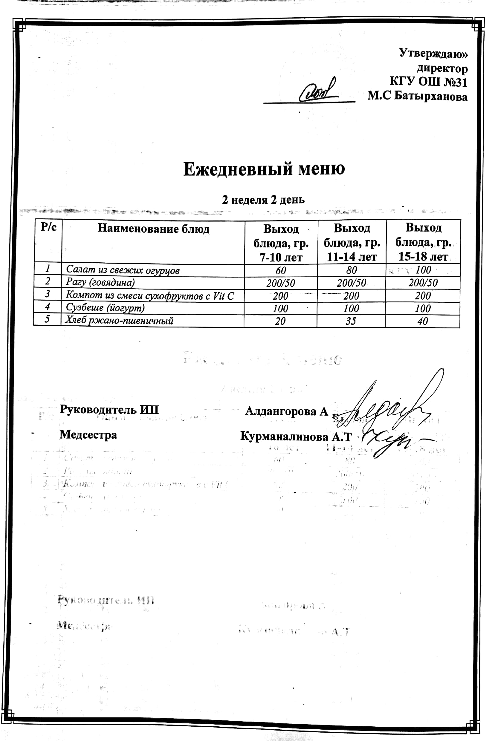 Ас мәзірі 2 апта 1 күн. Меню 2 неделя 1 день