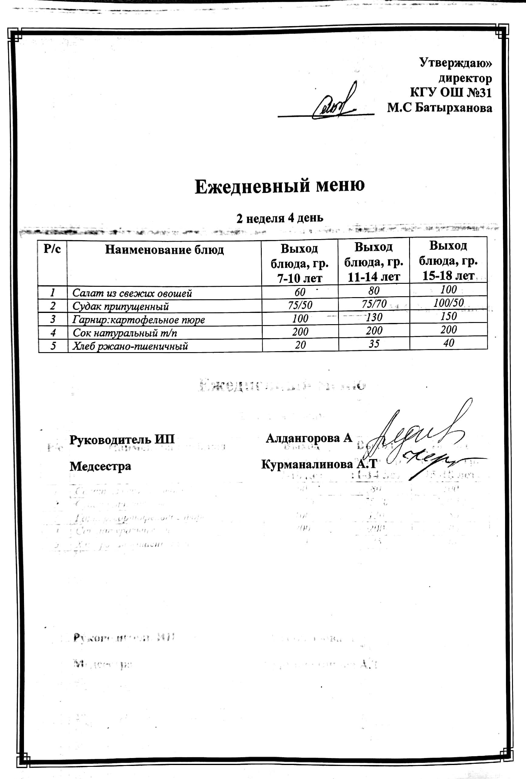 Ас мәзірі 2 апта 4 күн. Меню 2 неделя 4 день