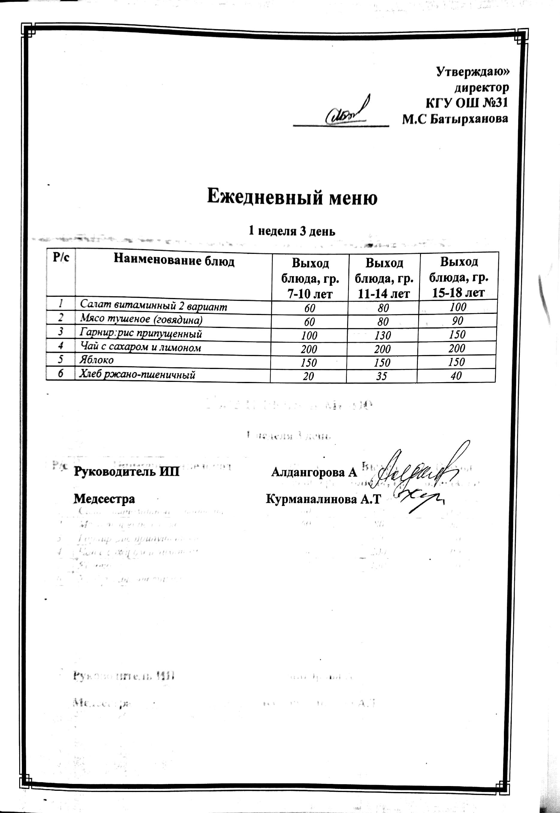 Ас мәзірі 2 апта 3 күн. Меню 2 неделя 3 день
