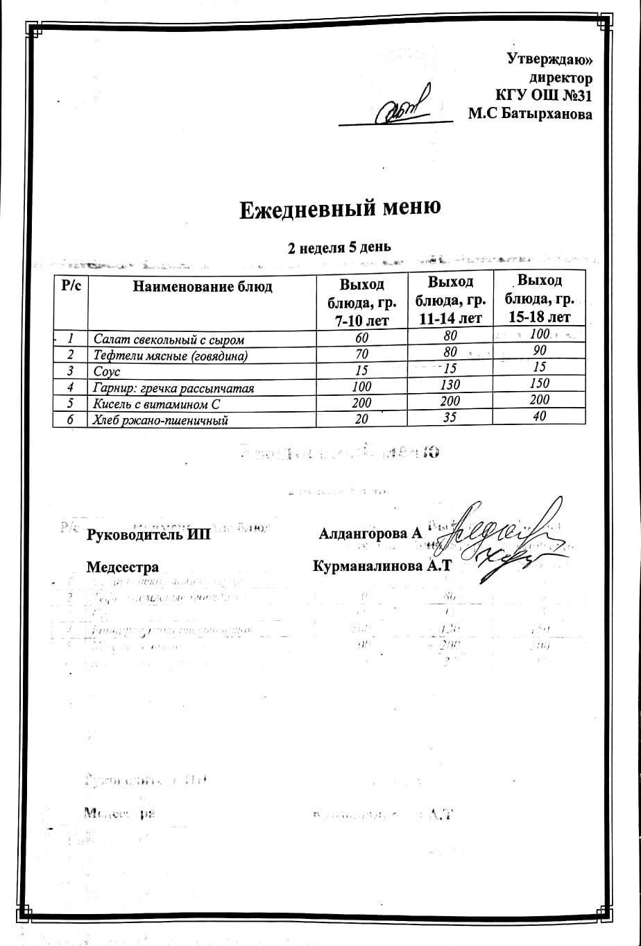 Ас мәзірі 2 апта 5 күн. Меню 2 неделя 5 день