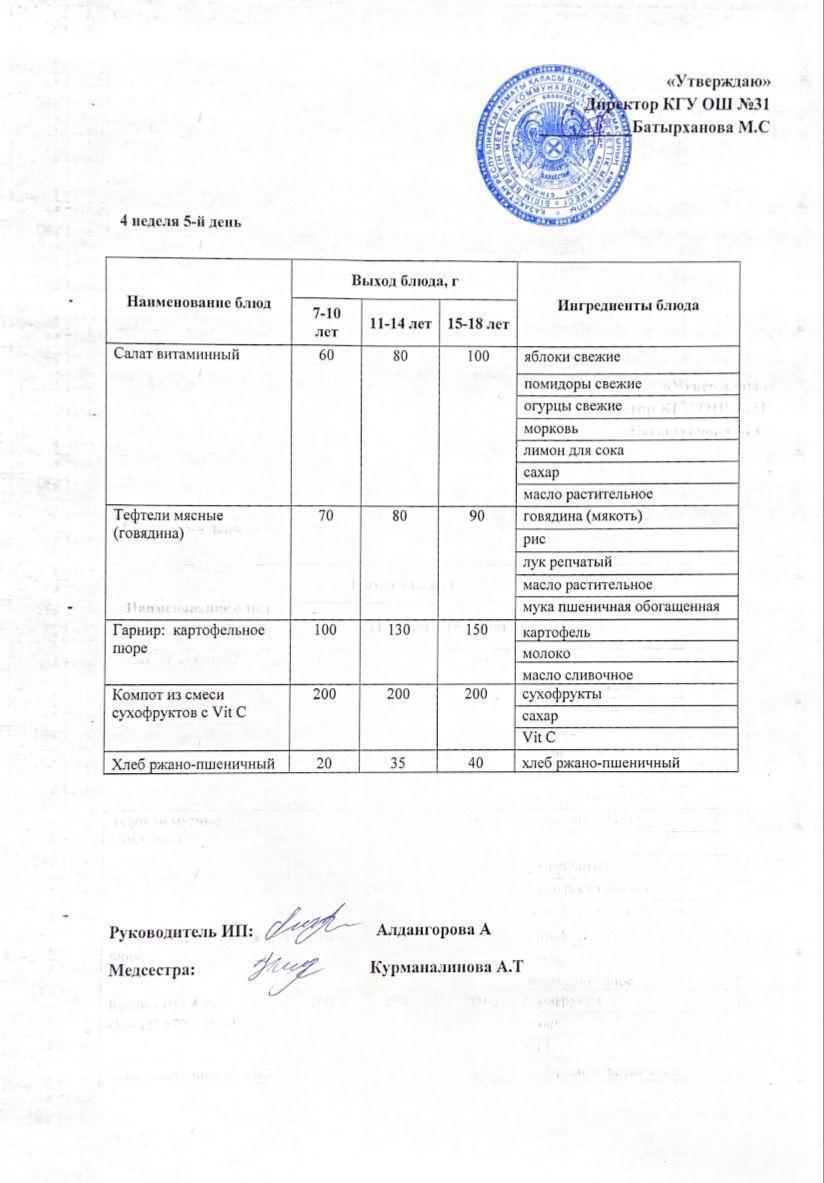 Ас мәзірі 4 апта 5 күн. Меню 4 неделя 5 день.