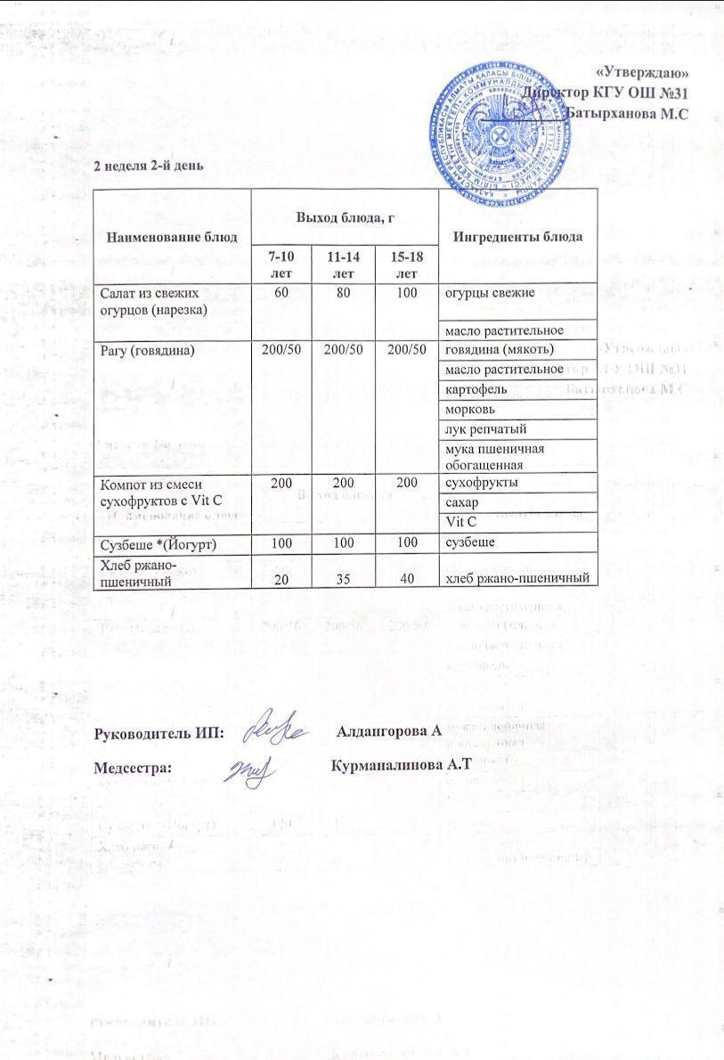 Ас мәзірі 2 апта 2 күн. Меню 2 неделя 2 день