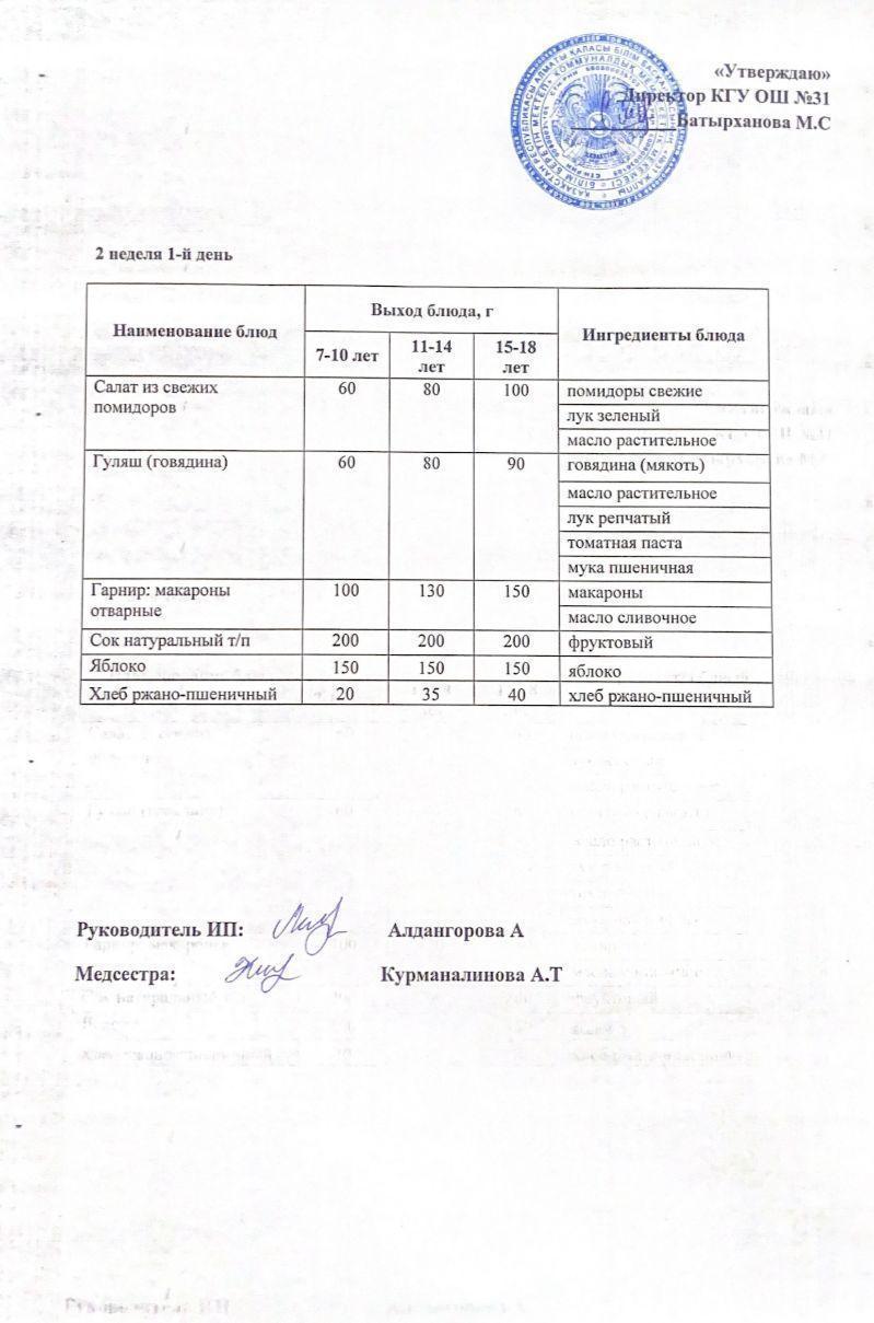 » Ас мәзірі 2 апта 1 күн. Меню 2 неделя 1 день