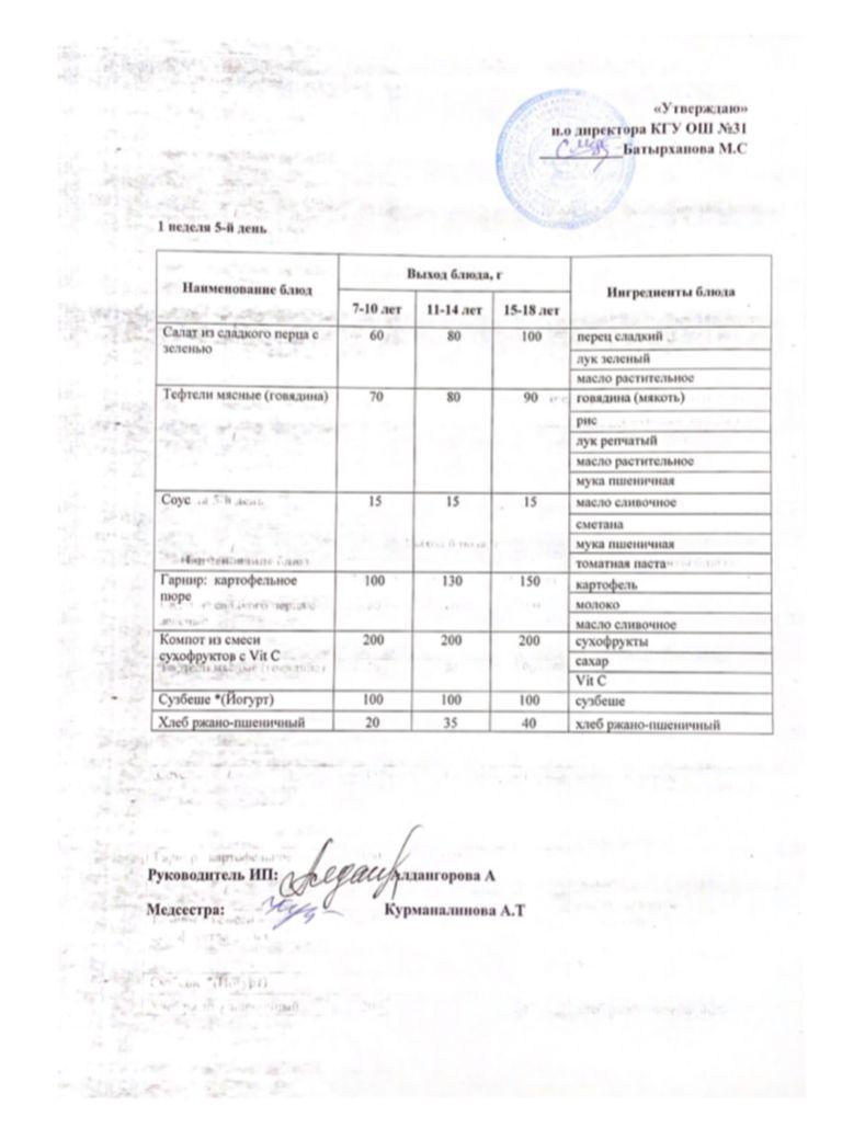 » Ас мәзірі 1 апта 5 күн. Меню 1 неделя 5 день.