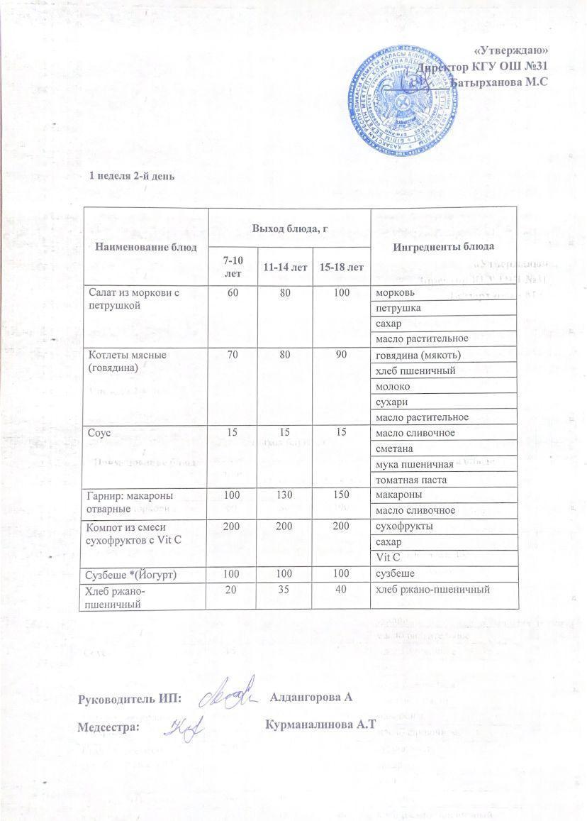 » Ас мәзірі 1 апта 2 күн. Меню 1 неделя 2 день