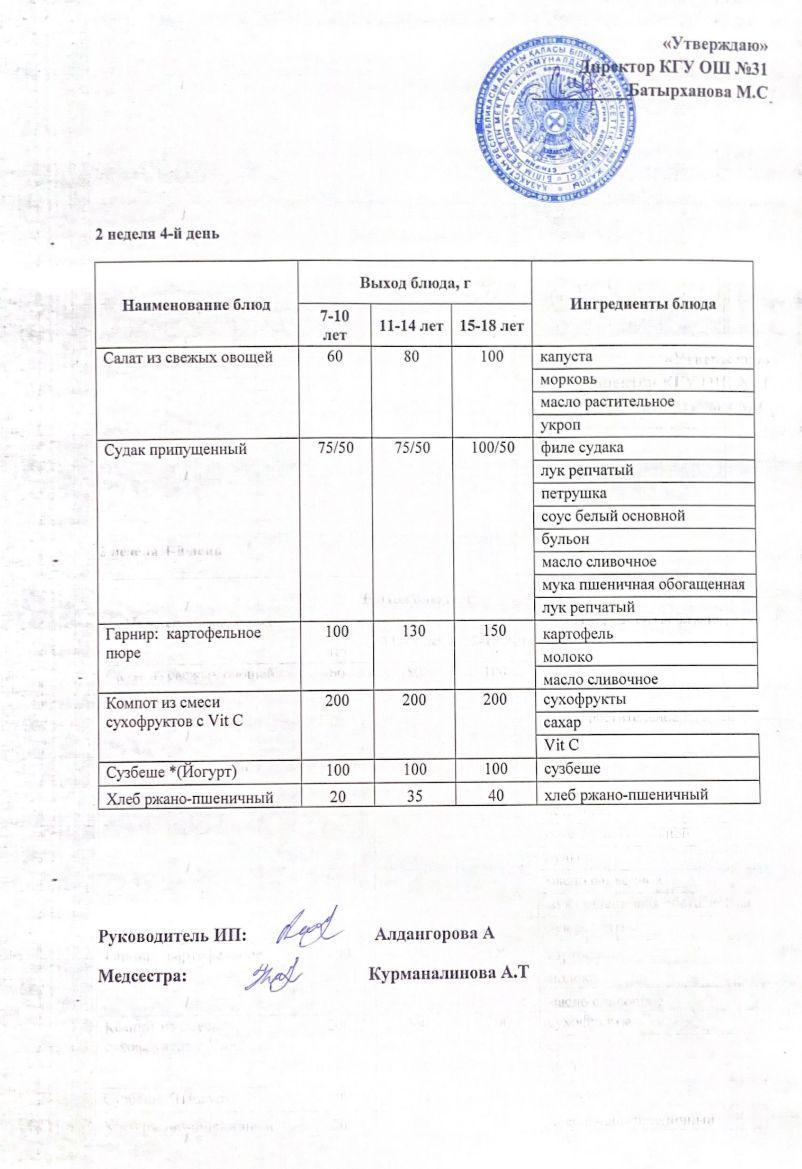 Ас мәзірі 2 апта 4 күн. Меню 2 неделя 4 день