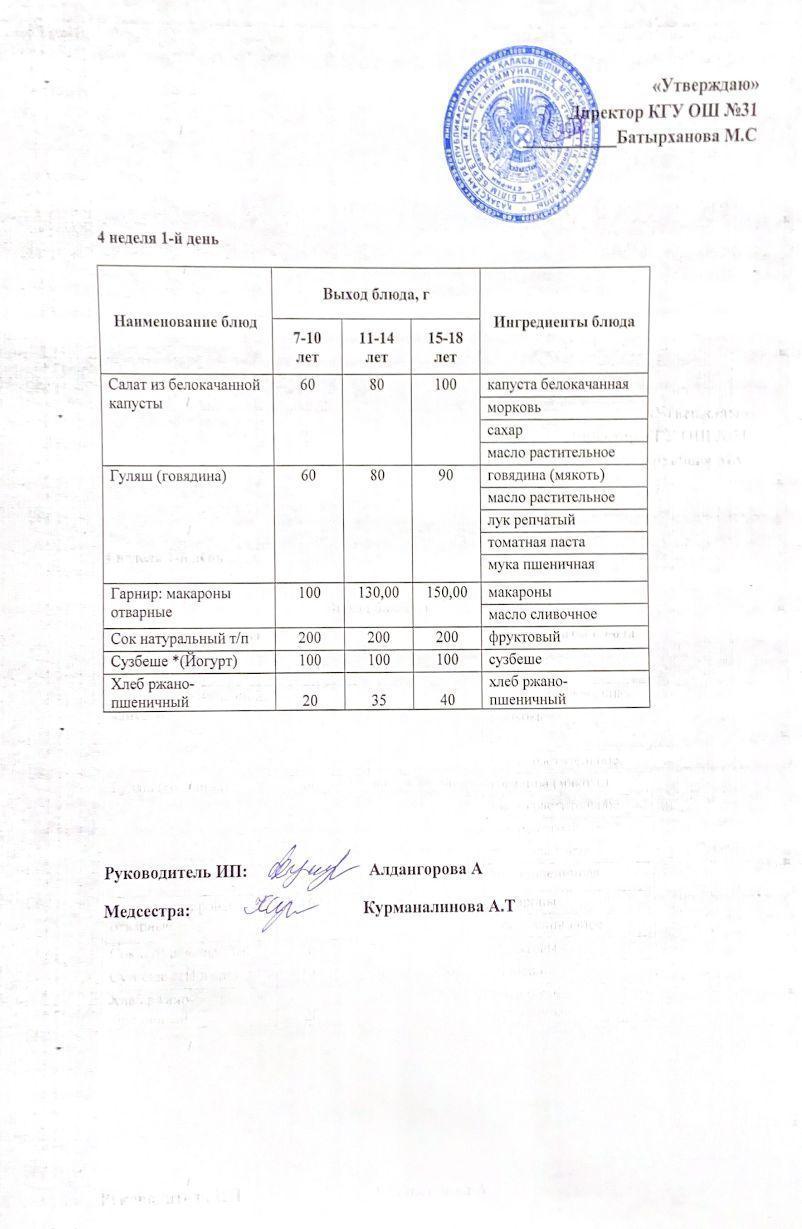 Ас мәзірі 4 апта 1 күн. Меню 4 неделя 1 день