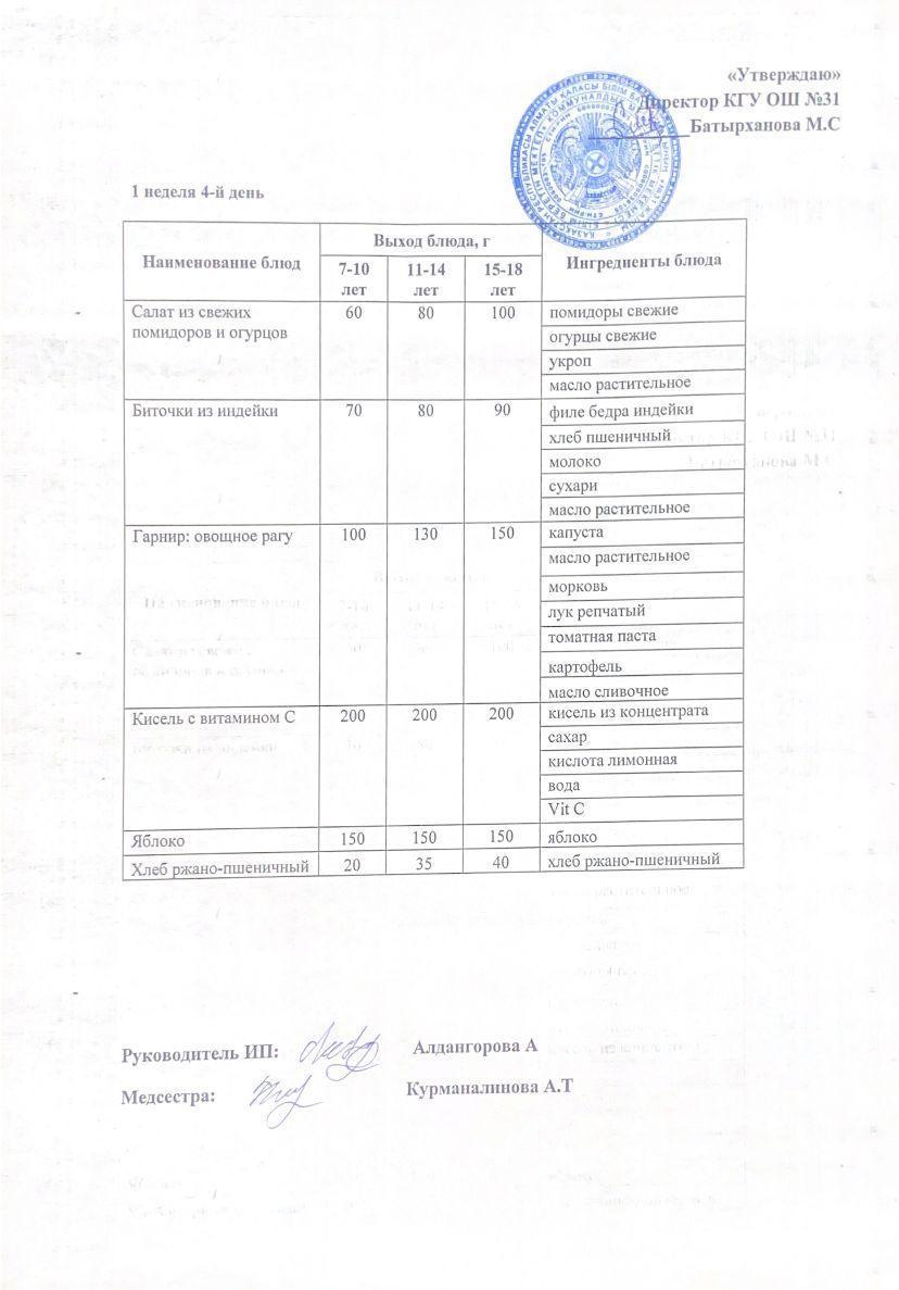 Ас мәзірі 1 апта 4 күн. Меню 1 неделя 4 день.