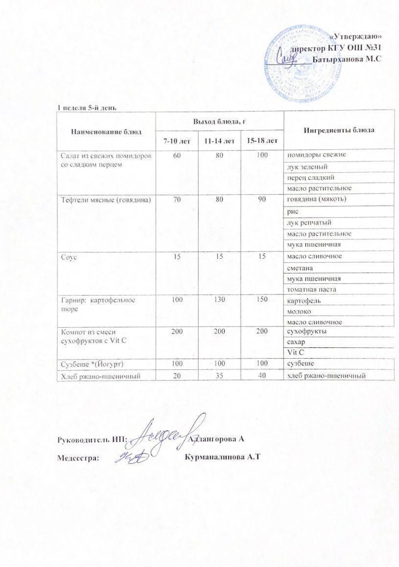 » Ас мәзірі 1 апта 5 күн. Меню 1 неделя 5 день