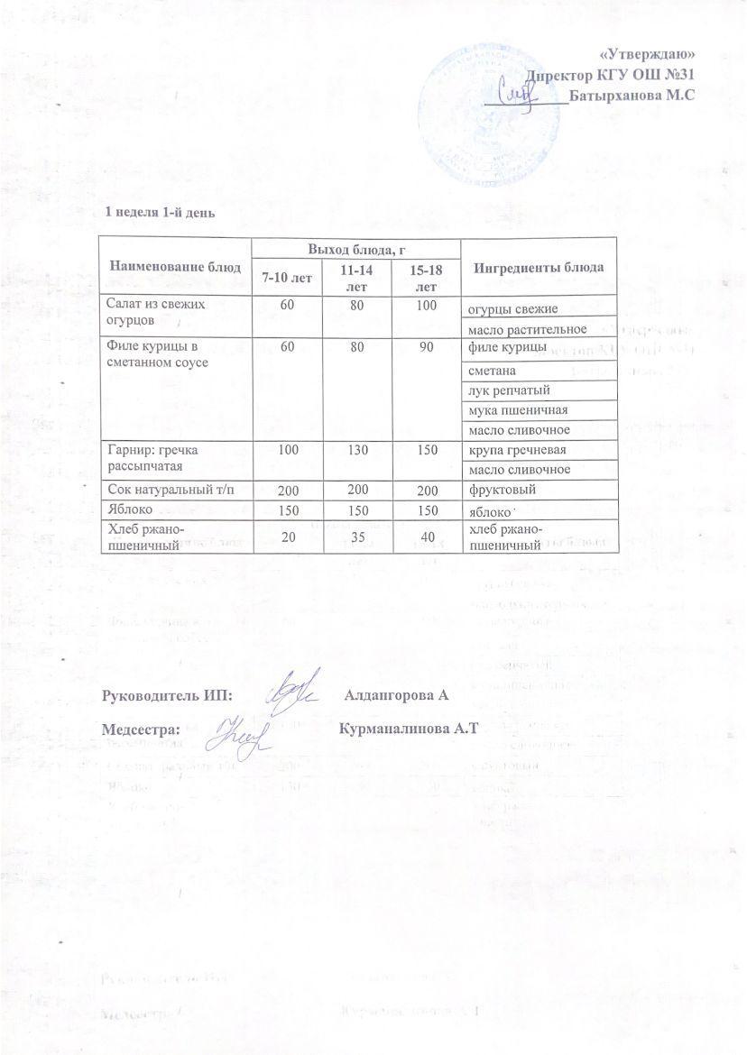 » Ас мәзірі 1 апта 1 күн. Меню 1 неделя 1 день