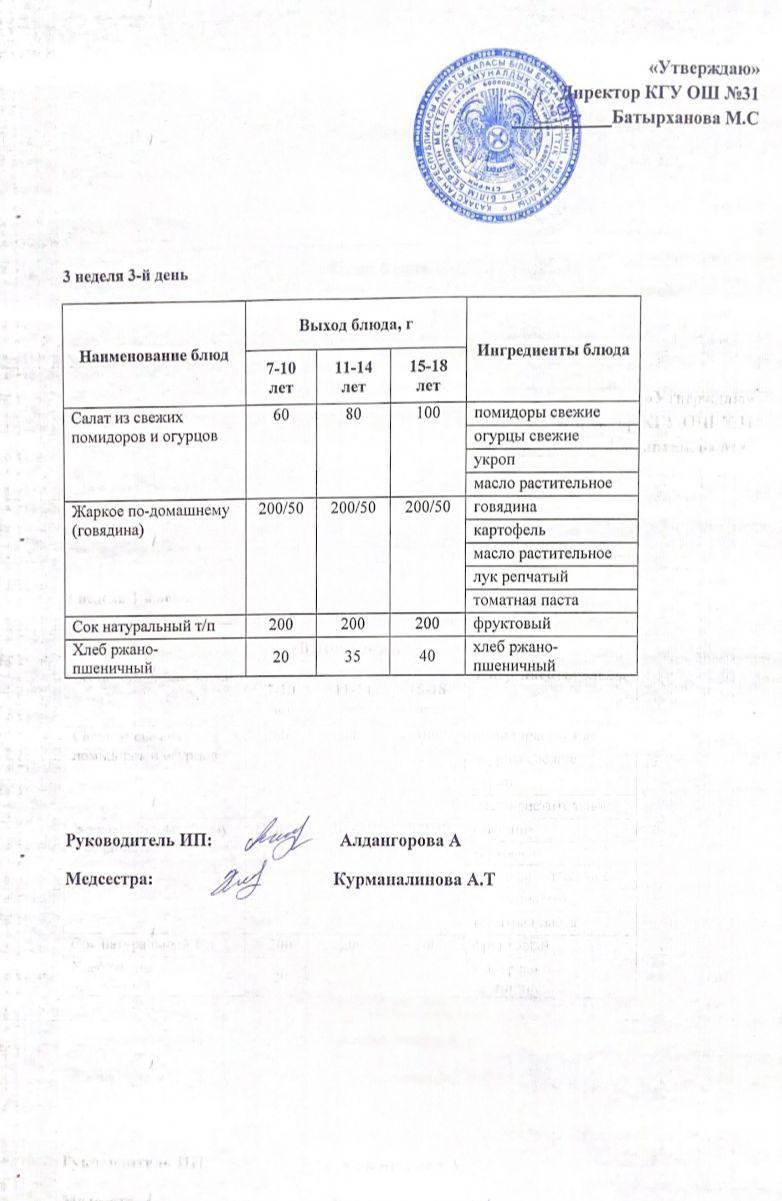 Ас мәзірі 3 апта 3 күн. Меню 3 неделя 3 день.