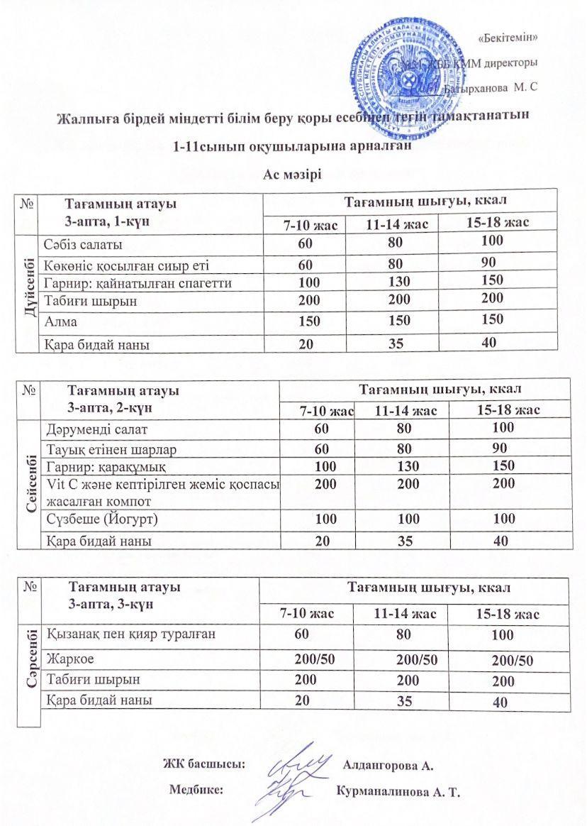 Ас мәзірі 2 апта 3 күн. Меню 2 неделя 3 день.