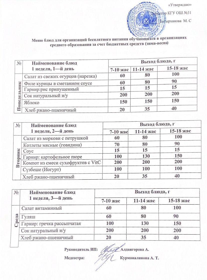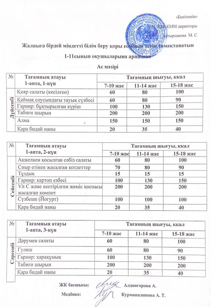 » Ас мәзірі 1 апта 3 күн. Меню 1 неделя 3 день.