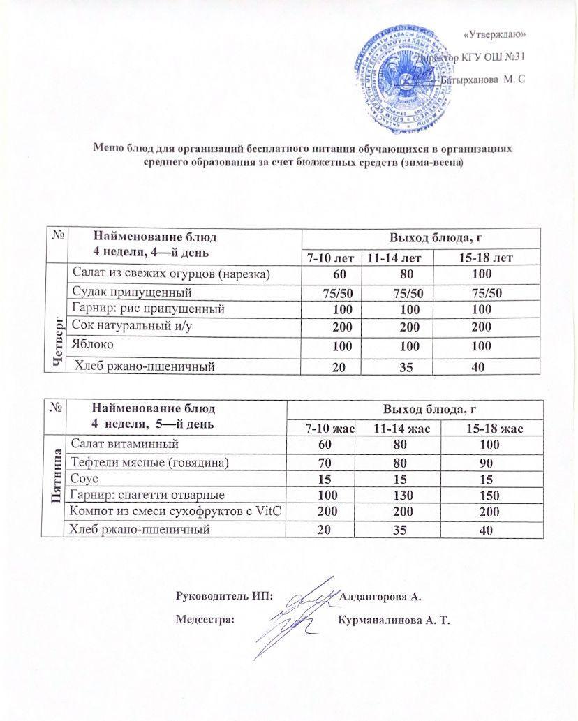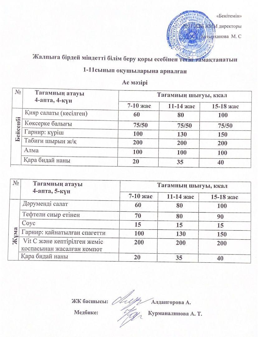 Ас мәзірі 4 апта 5 күн. Меню 4 неделя 5 день.
