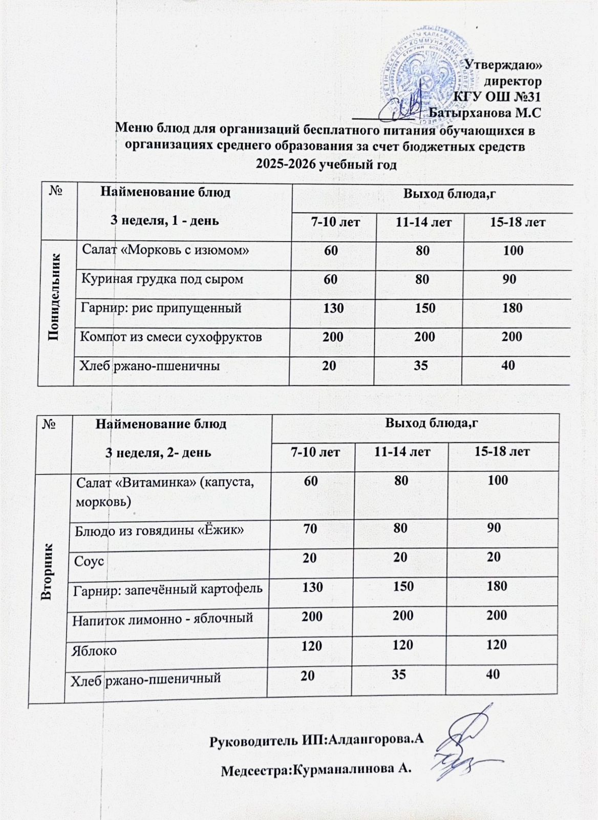 Ас мәзірі 3 апта 2 күн. Меню 3 неделя 2 день.