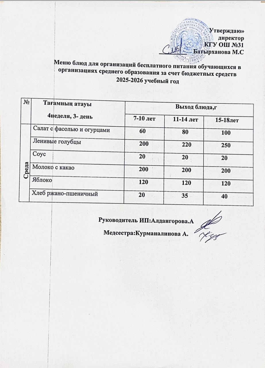 Ас мәзірі 4 апта 3 күн. Меню 4 неделя 3 день.
