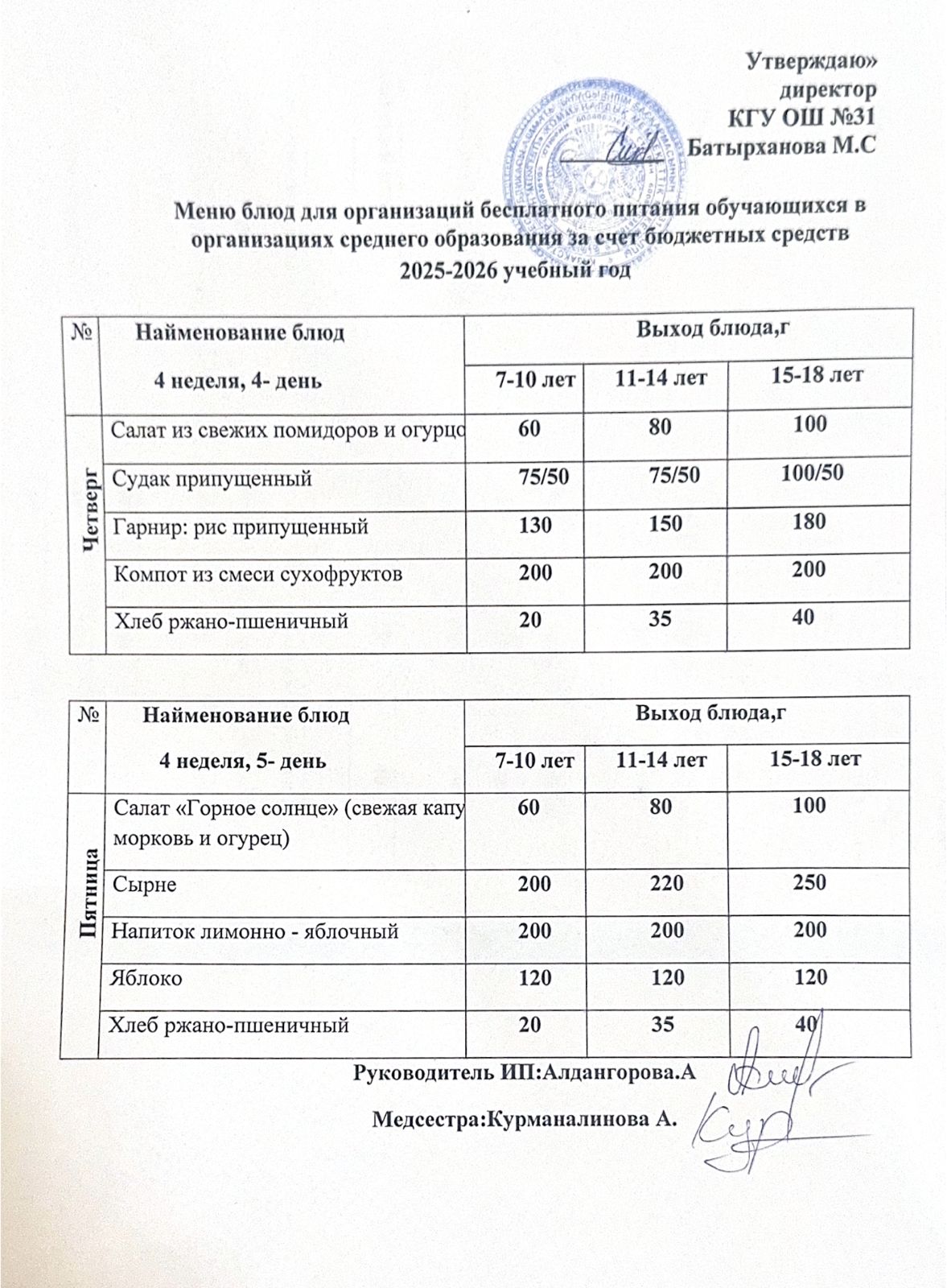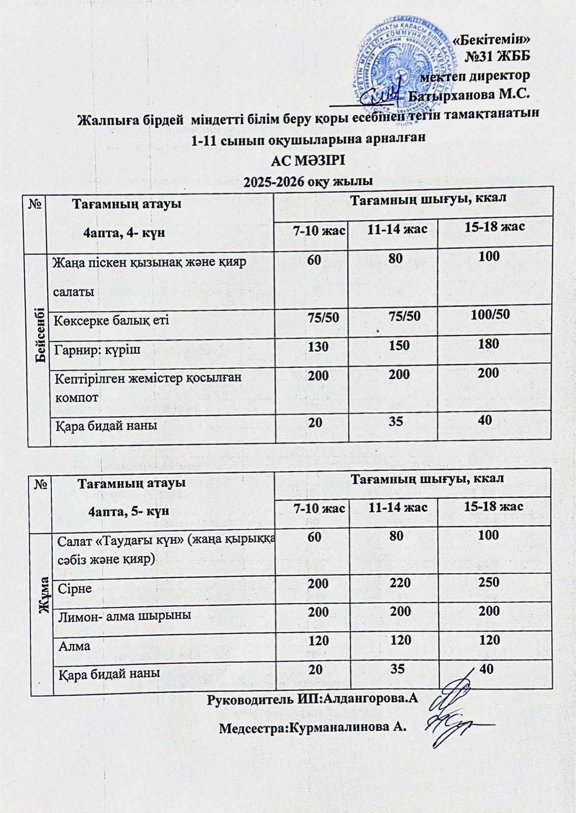 Ас мәзірі 4 апта 5 күн. Меню 4 неделя 5 день.