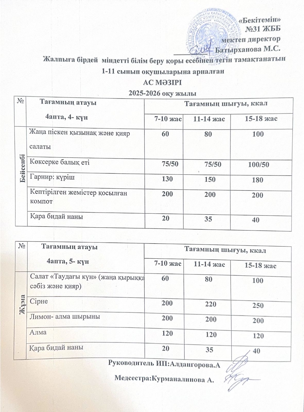Ас мәзірі 4 апта 5 күн. Меню 4 неделя 5 день.