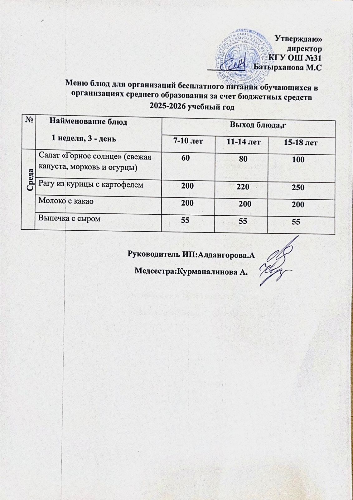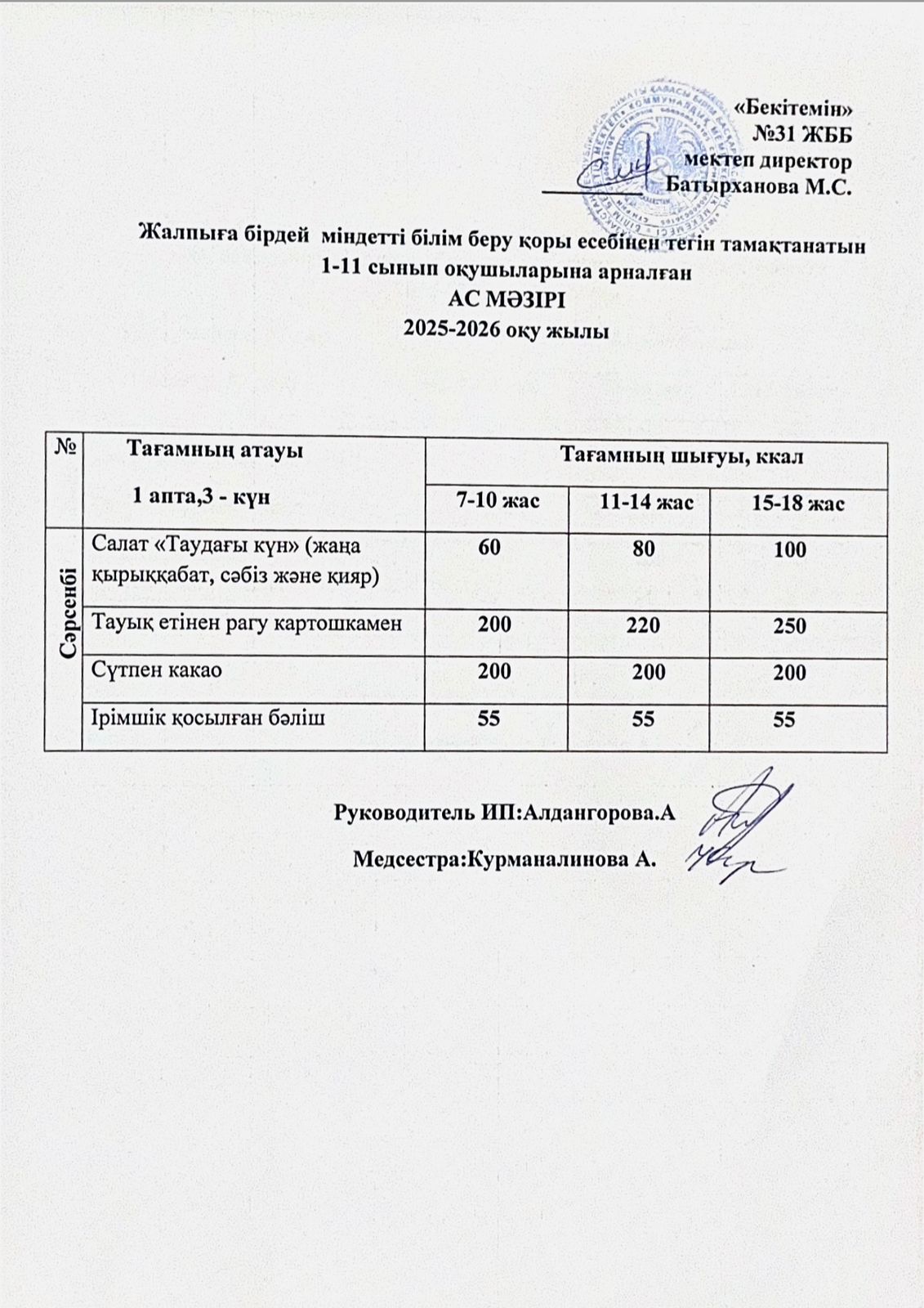Ас мәзірі 2 апта 3 күн. Меню 2 неделя 3 день.