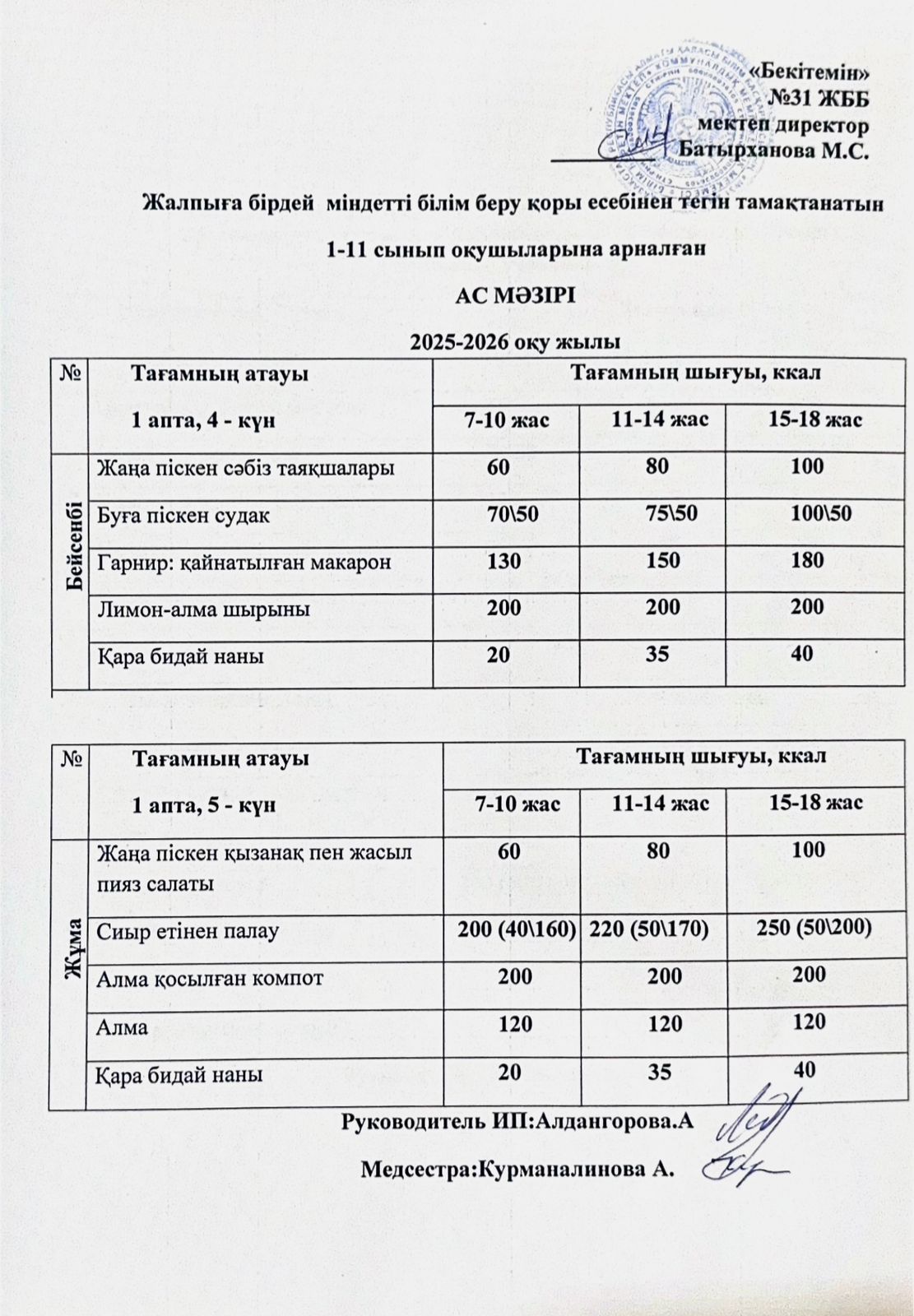 Ас мәзірі 4 апта 5 күн. Меню 4 неделя 5 день.