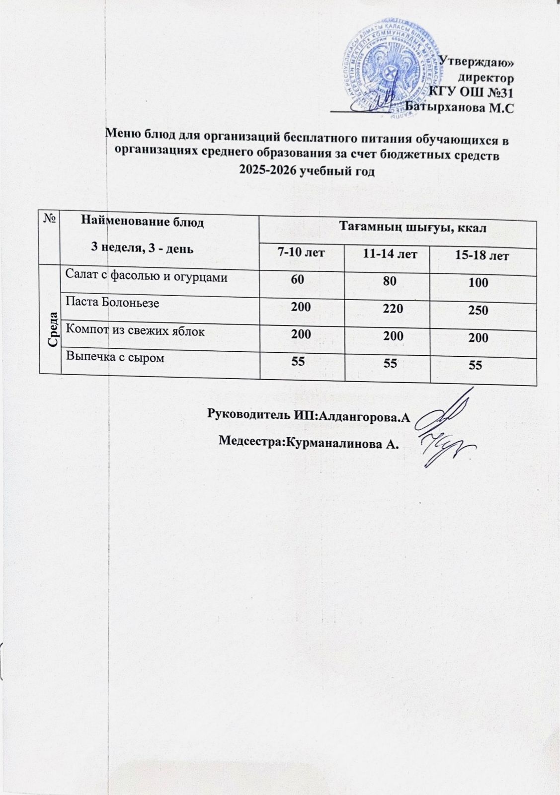 Ас мәзірі 2 апта 3 күн. Меню 2 неделя 3 день.