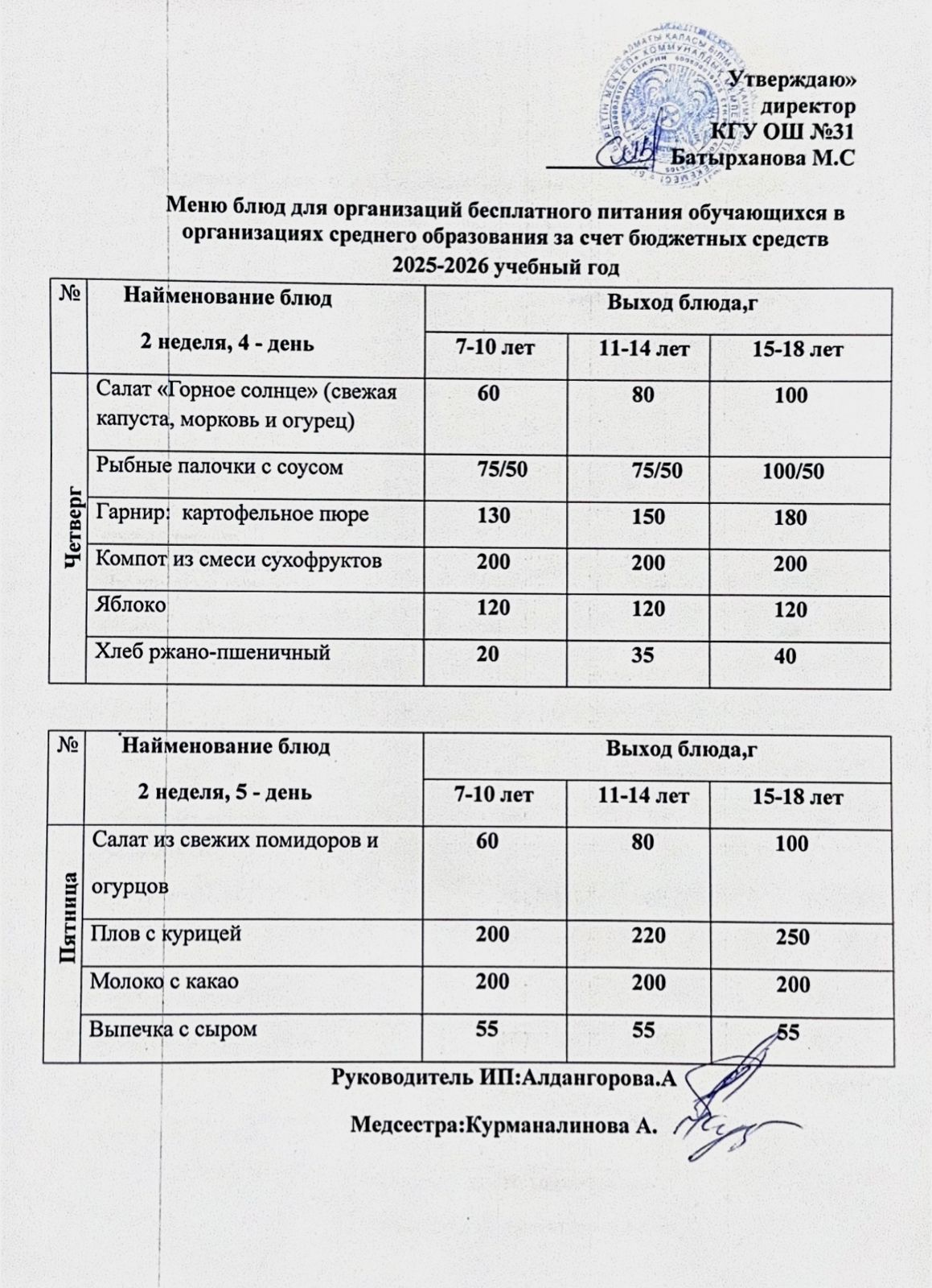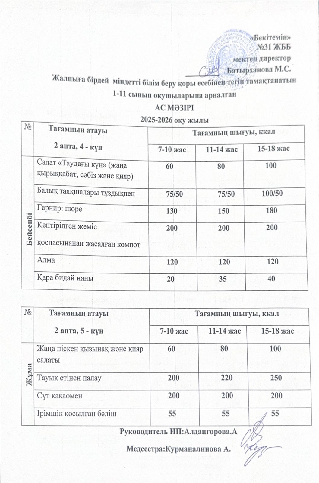 Ас мәзірі 2 апта 5 күн. Меню 2 неделя 5 день.