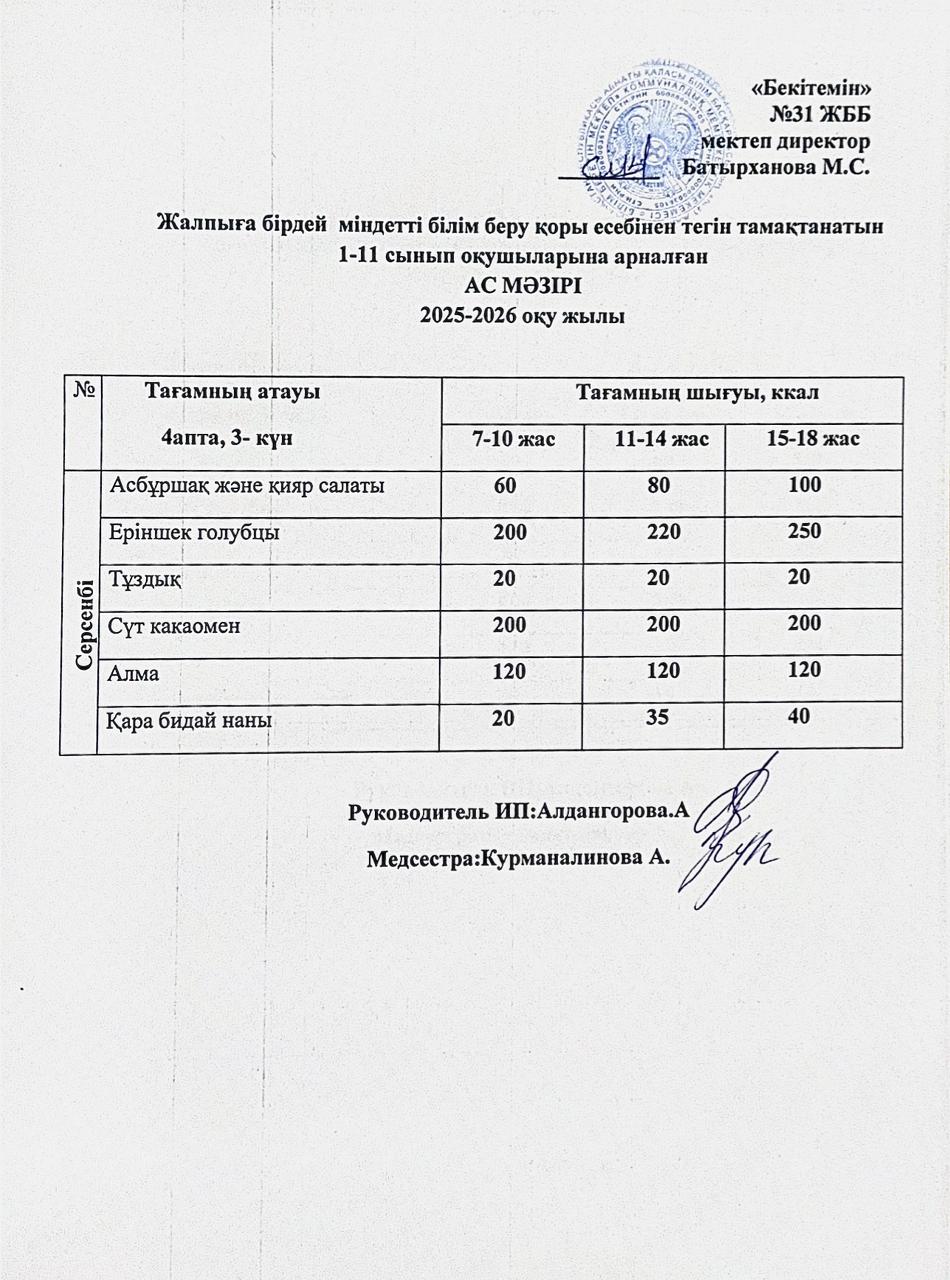 Ас мәзірі 4 апта 3 күн. Меню 4 неделя 3 день.