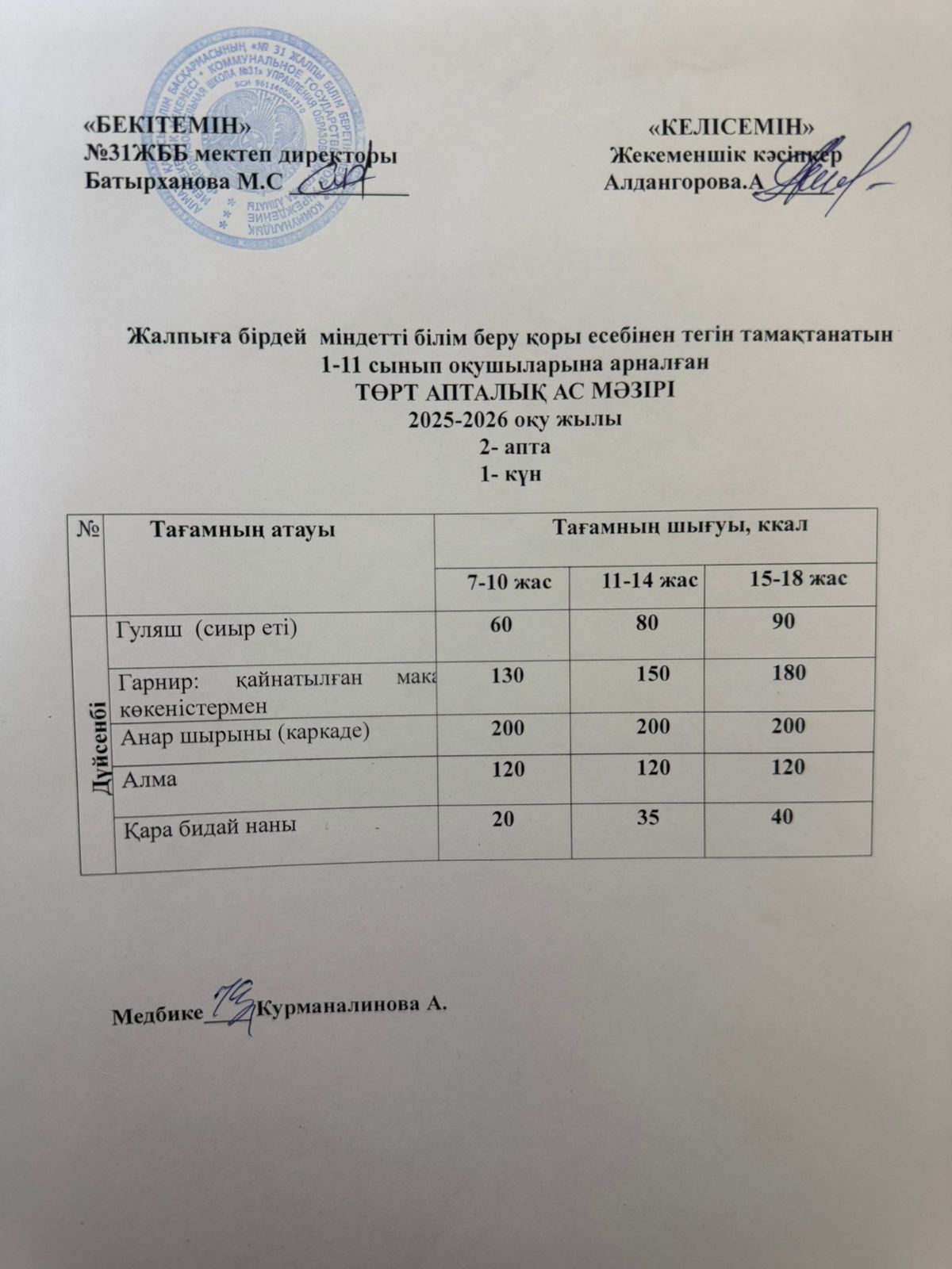» Ас мәзірі 2 апта 1 күн. Меню 2 неделя 1 день.