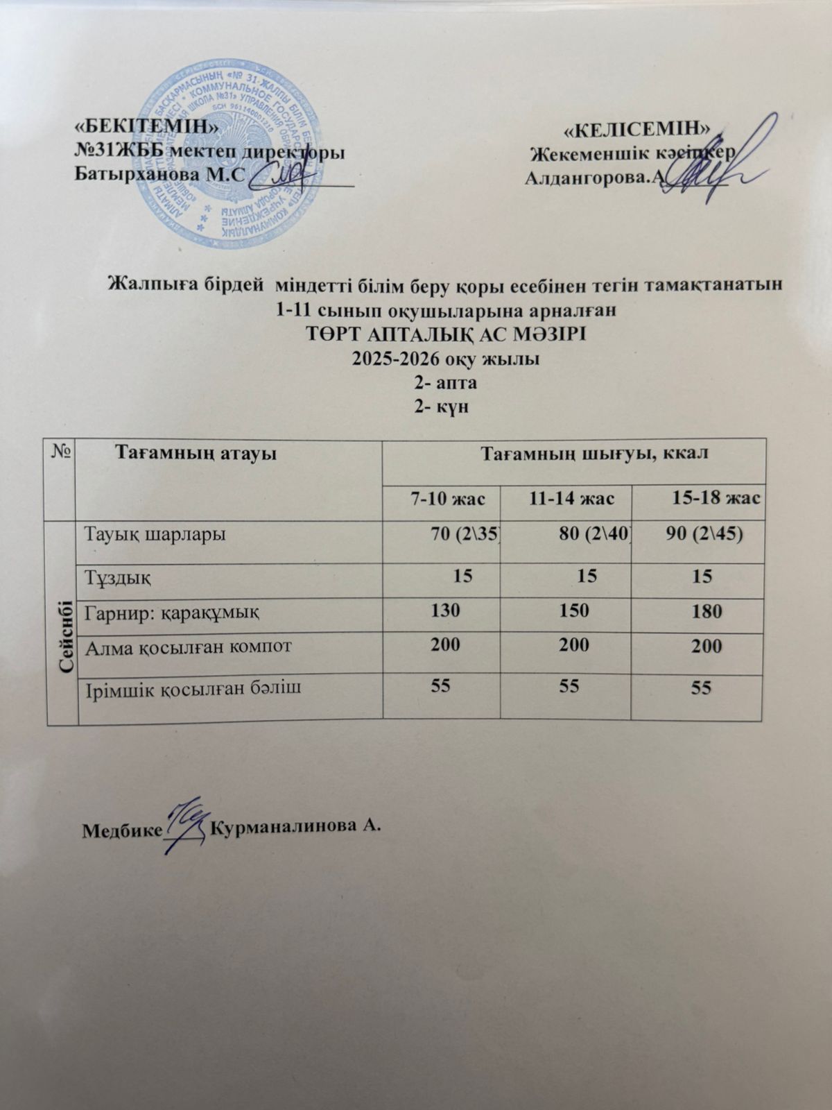 Ас мәзірі 2 апта 3 күн. Меню 2 неделя 3 день.