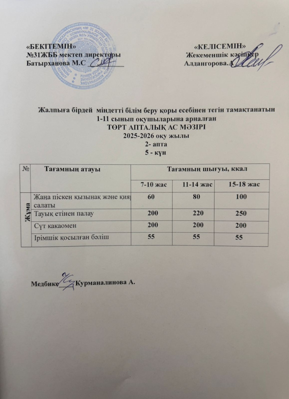 Ас мәзірі 2 апта 5 күн. Меню 2 неделя 5 день.
