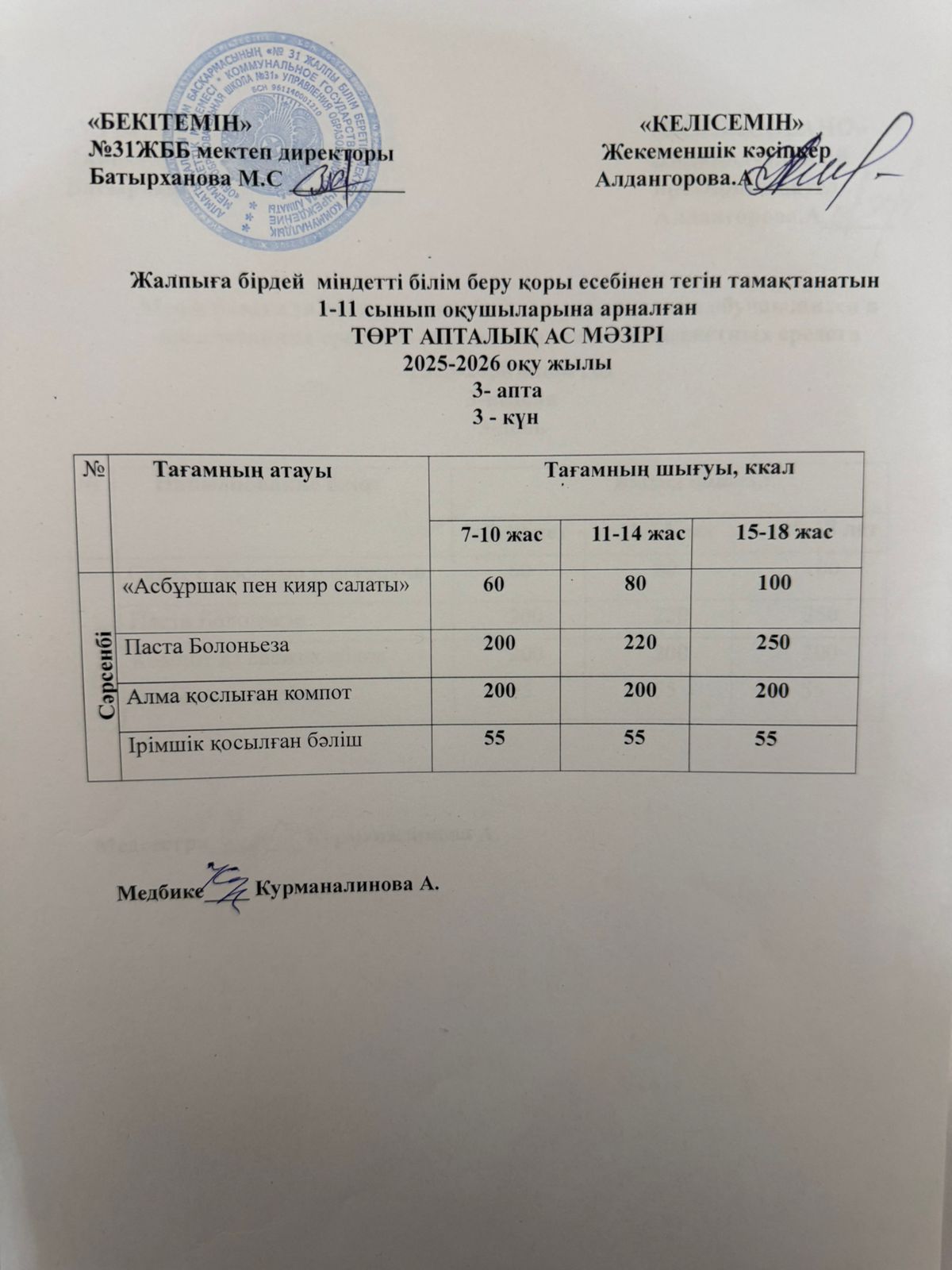 Ас мәзірі 4 апта 3 күн. Меню 4 неделя 3 день.
