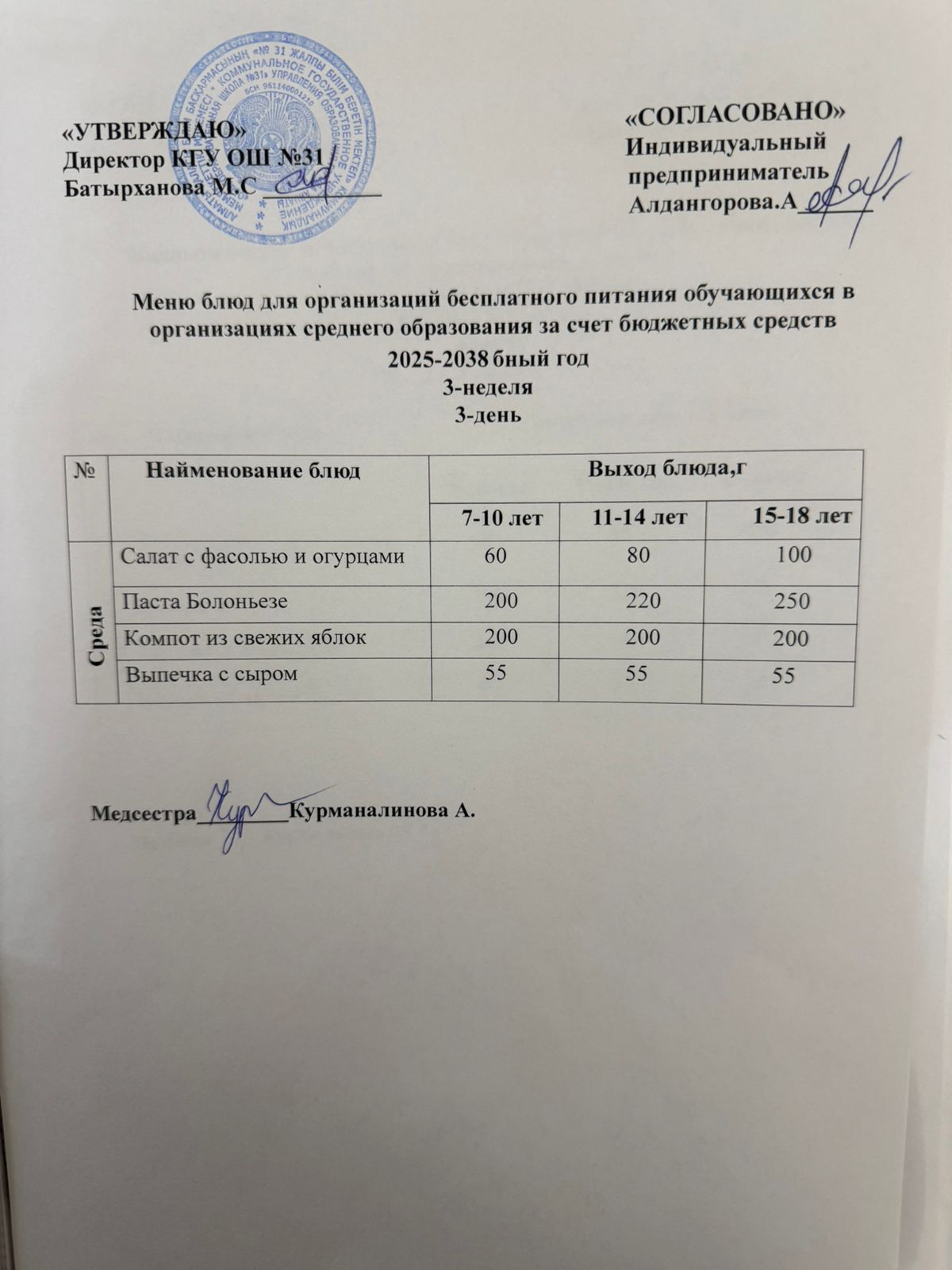 Ас мәзірі 2 апта 3 күн. Меню 2 неделя 3 день.