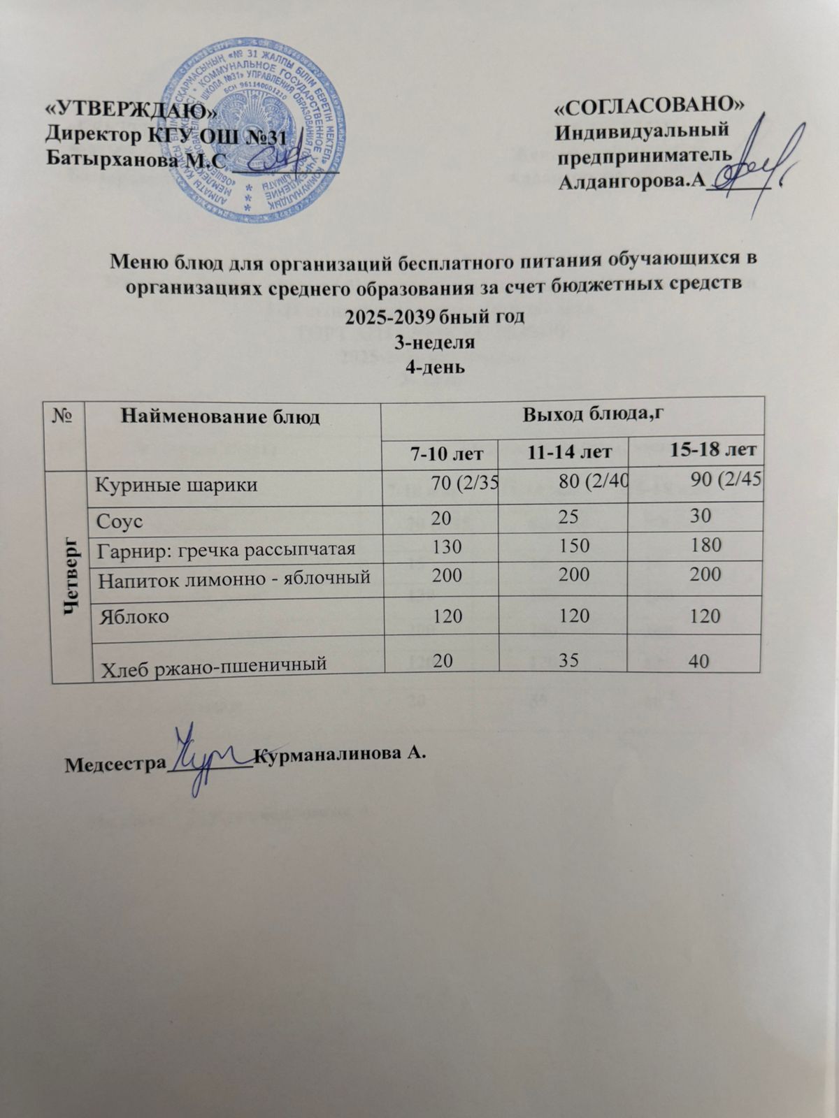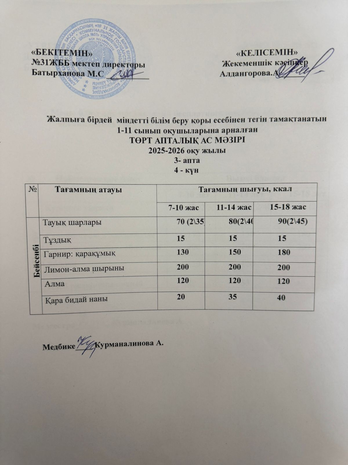 Ас мәзірі 3 апта 4 күн. Меню 3 неделя 4 день.